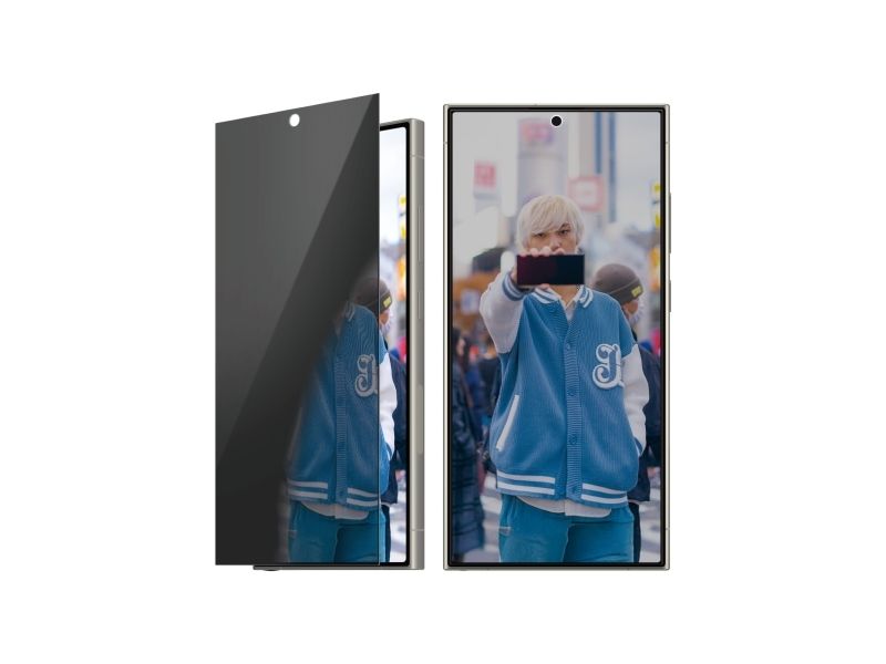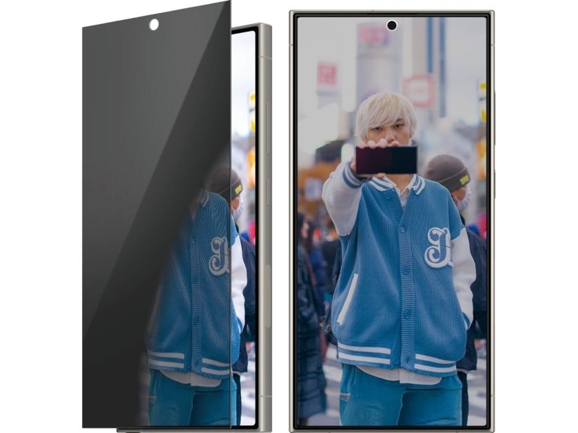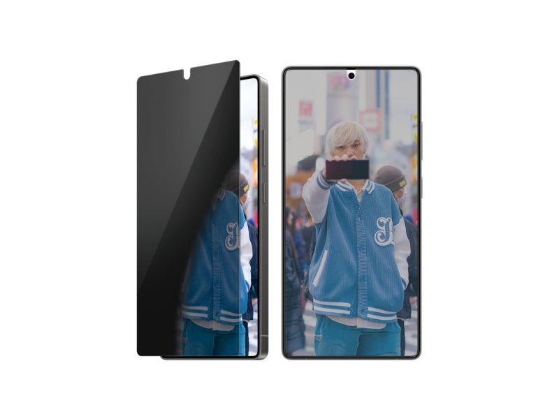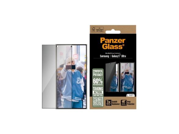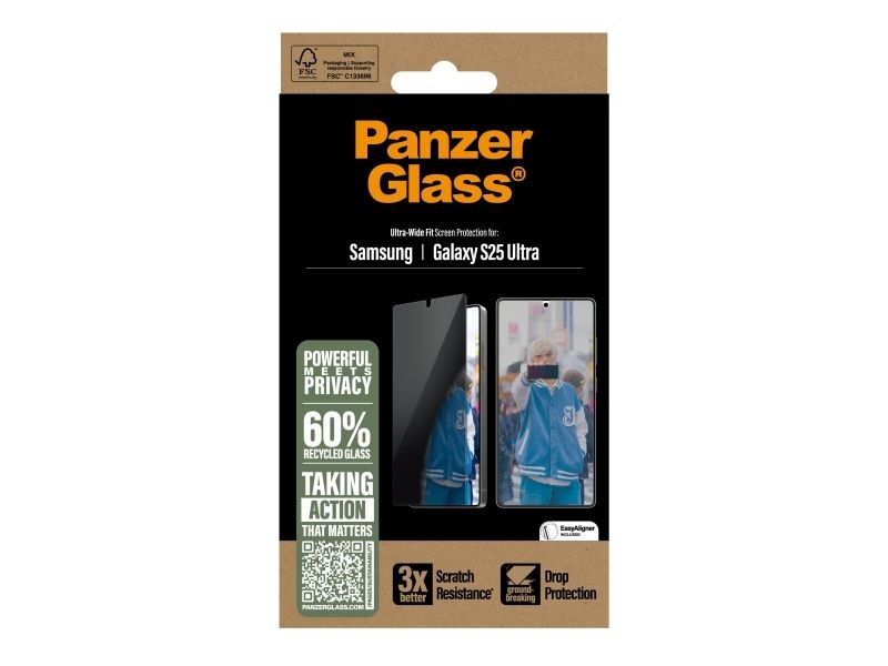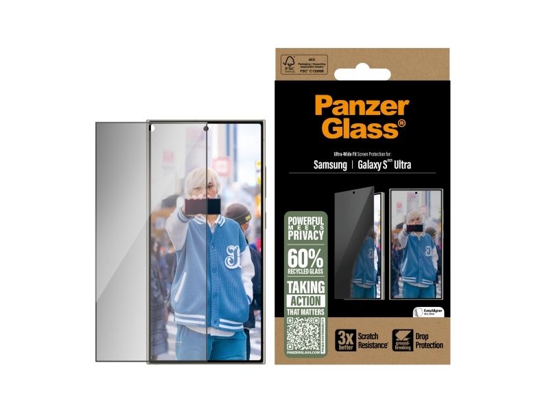 Check out our PanzerGlass privacy screen protector! Made with 60% recycled glass, it keeps your personal stuff hidden from nosy neighbors on the train, at the coffee shop, or in the office. The privacy filter makes your screen's content invisible to anyone but you. It even has a smudge-free coating that reduces traces of fingerprints and grease and ensures 100% compatibility with your screen's ultrasonic fingerprint reader, so you can be sure that your phone unlocks smoothly every time.This screen protector keeps your phone screen safe from accidental bumps, crushing falls and other hazards of everyday life. Or to put it in more sustainable terms: It prolongs the lifetime of your phone, thereby postponing the need to produce new phones. This is one way of working toward a more sustainable future. Another is to use less packaging: For this screen protector, we have managed to reduce the paper packaging by 33%* compared to previous models. This product comes in a recyclable FSC-certified box.The screen protector comes with an EasyAligner that makes installation a piece of cake (seriously!), and to make it even easier, we've included step-by-step instructions as well as a QR code for quick access to our online how-to video. And remember: Once the screen protection is applied, you'll never again fear the sight of your phone tumbling to the ground screen first. This may not happen, but if it does, you'll regret not having clicked "add to cart".The screen protector is Ultra-Wide Fit, meaning it covers the front surface of your phone to provide superb screen protection and a complete screen view, while still leaving a little room around the edges for a PanzerGlass case. If you want extra phone protection, combine the screen protector and case with a PanzerGlass PicturePerfect or Hoops camera lens protector.*Measured by third-party lab by comparing the mass of the new paper packaging introduced in 2023 with the mass of the previous paper packaging introduced in 2022 (CPRTC, report No. ZSA20231301-0016).