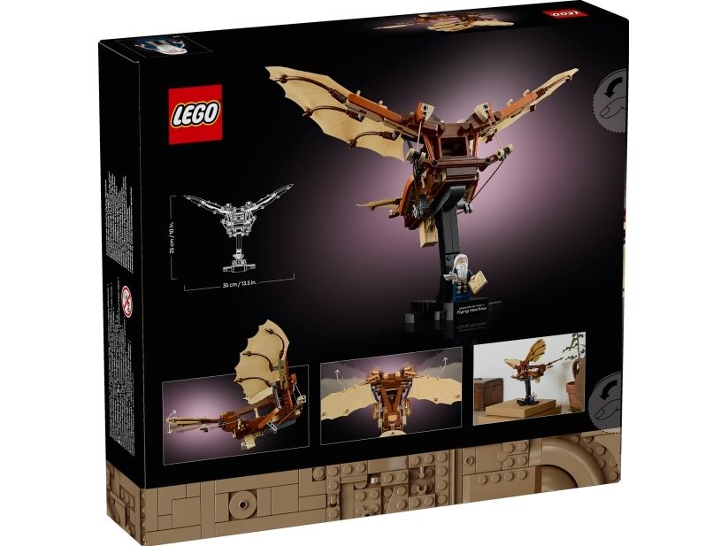 Med settet LEGO® Icons Leonardo da Vincis flymaskin (10363) kan du eller andre historieinteresserte voksne utforske kunstnerisk innovasjon på nært hold. Gjenskap da Vincis visjonære maskin med sitt åpne flyskrog og tekstildekkede vinger som beveges ved hjelp av et synlig system av snorer, hengsler og taljer. Denne fengslende utstillingsmodellen med sokkel inkluderer en avtakbar minifigur av Leonardo da Vinci med fjærpenn og skisse.