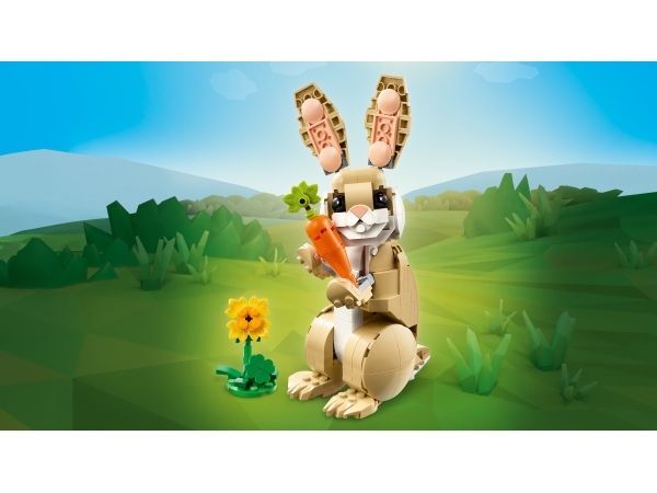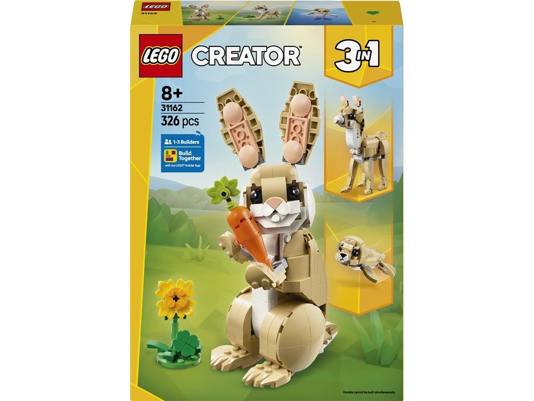 Gi dyrekjære barn fra åtte år muligheten til å finne på gøyale eventyr med byggesettet LEGO® Creator 3-i-1 Søt kanin (31162). Dyrelekesettet inkluderer en kaninleke for barn, med hode, ører, forben og bakben som kan beveges. Figuren kan stå på to eller fire ben, og settet inkluderer også en solsikke og en gulrot.