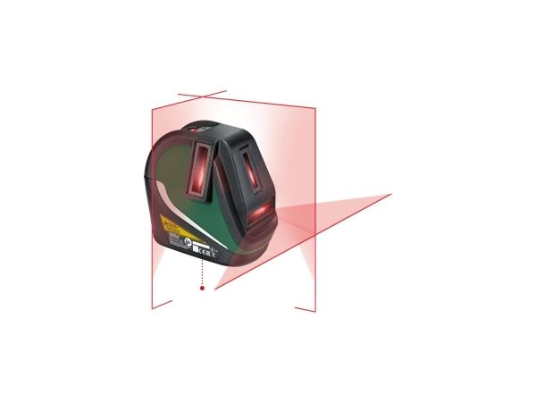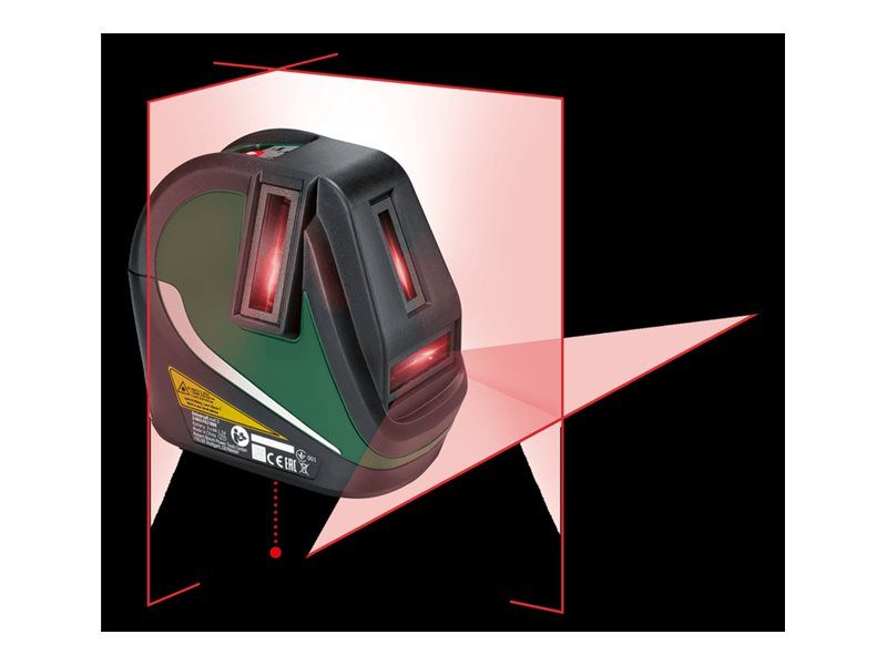 90° vertikal linje, red plumb point, selvnivellerende, inclination measurer, diagonal linjemodus, 120°-bredvinkelstråler, 1/4" tripod head, 650 nm laser line, 635 nm laser point, 4 s nivelleringstid