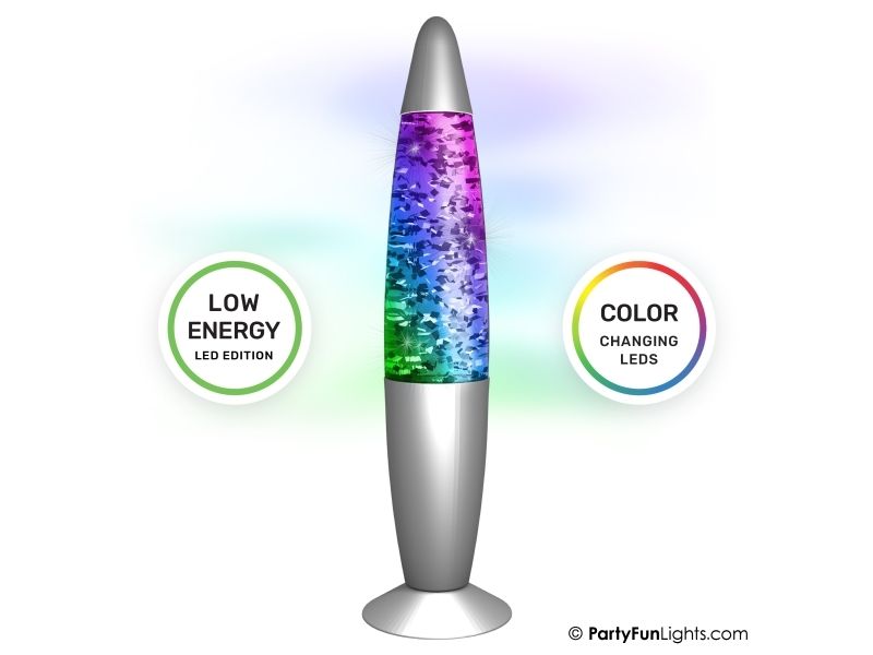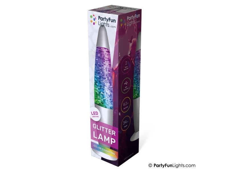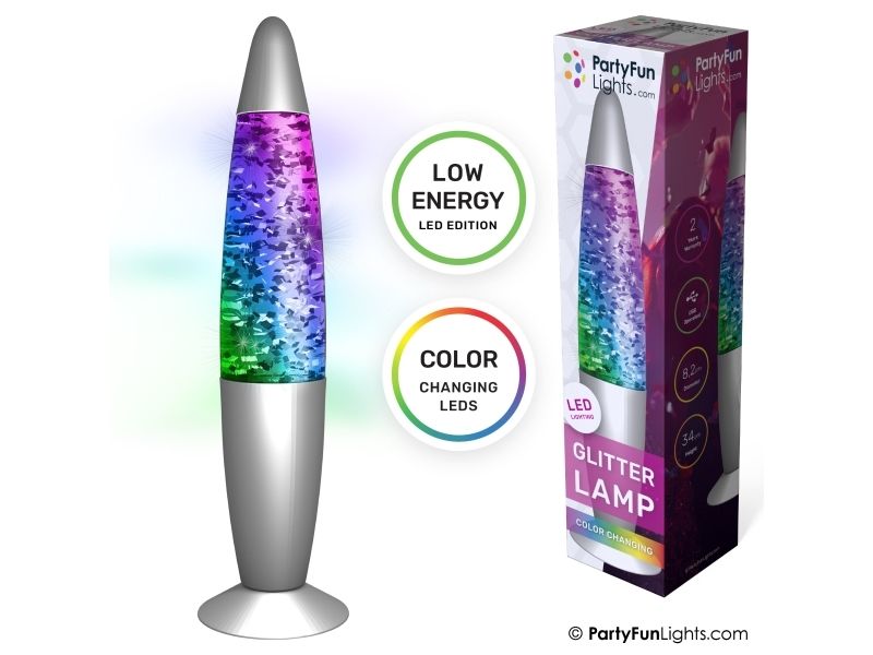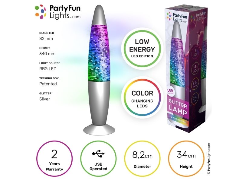 Med denne glitter lampe kan du skabe en cool og afslappende stemning i ethvert rum. Glitter lampen har 9 farveskiftende LED'er og en samlet højde på 34 cm. Tilslut blot glitter lampen med det medfølgende USD-kabel. og nyd den den hypnotiserende effekt af svævende glitter.