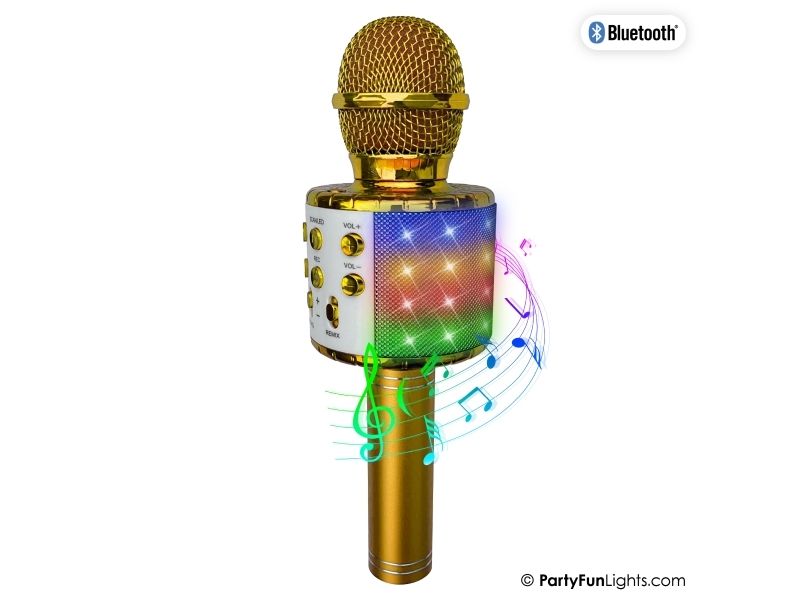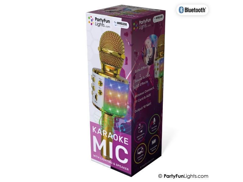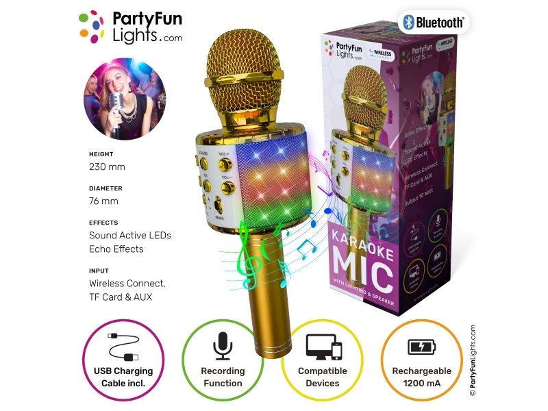 Sæt gang i festen med denne karaoke-mikrofon med højttaler og lydaktiverede LED-lyseffekter. Afspil dine yndlingssange trådløst via din smartphone eller en anden Bluetooth-enhed. og stjæl rampelyset ved at synge med via mikrofonen. Den lydaktiverede belysning løfter dit karaoke-show til et nyt niveau. Afspil musik via Bluetooth. TF-kort eller AUX. Højttaleren er kompatibel med både iOS- og Android-enheder. Dette sæt indeholder højttaler. mikrofon. mini-USB-kabel og AUX-kabel. Højttaleren på 10 watt har et indbygget genopladeligt batteri på 1200 mAh. Tag denne mikrofon med hvor som helst. og start et fantastisk show.