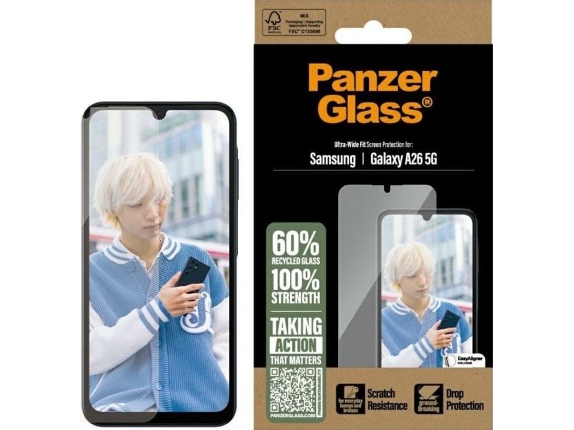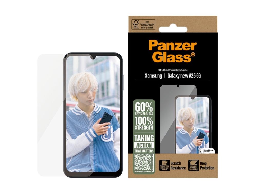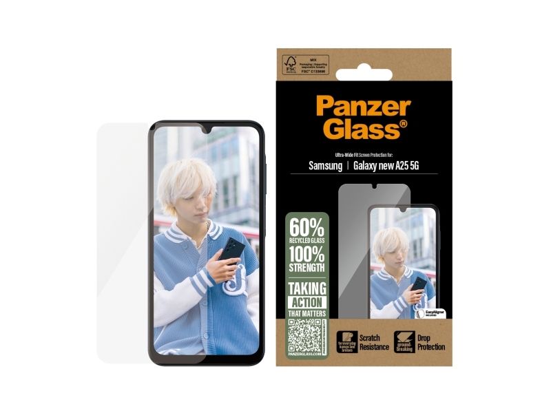 This PanzerGlass screen protector is made of 60% recycled material and provides higher scratch resistance. It even has an impressive shock-resistance capabilities and high-level drop protection, this PanzerGlass screen protector keeps your phone screen safe?from?accidental bumps against sharp-edged dangers, crushing falls onto stone-hard pavements and other hazards of everyday life. It also has a smudge-free coating that reduces traces of fingerprints and grease. Can it get any better? Tt make it even easier, we've included step-by-step instructions as well as a QR code for quick access to our online how-to video. And remember: Once the screen protection is applied, you'll never again fear the sight of your phone tumbling to the ground screen first. This may not happen, but if it does, you'll regret not having clicked "add to cart". This screen protection prolongs the lifetime of your phone so that one day you can pass it on to someone else who will love it just as much as you do. This is one way of working toward a more sustainable future. Another is to use less packaging: For this screen protector, we have managed to reduce the paper packaging by 33%* compared to previous models. And this product comes in a box made of recyclable FSC-certified paper. The screen protector is Ultra-Wide Fit, which means that it covers the front surface of your phone, providing a complete and crystal-clear view of your screen while still leaving a little room around the edges for a PanzerGlass case. If you want 360-degree phone protection, combine the screen protector and case with a PanzerGlass PicturePerfect or Hoops camera lens protector. *Measured by third-party lab by comparing the mass of the new paper packaging introduced in 2023 with the mass of the previous paper packaging introduced in 2022 (CPRTC, report No.?ZSA20231301-0016).