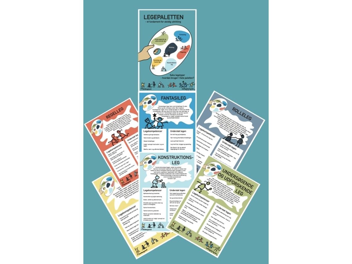 Legepaletten - en plakatserie - er et redskab til at arbejde bevidst med forskellige legetyper for at styrke alsidig leg i dagtilbud.Legepaletten tilbyder et fælles praksisnært sprog for leg, som kan bruges af pædagoger, pædagogiske assistenter, medhjælpere og vikarer i dagtilbud. Der er fokus på børnenes legekompetencer og på hvordan de forskellige legetyper understøttes.Plakatserien indeholder 7 plakater - en oversigtsplakat og én plakat for hver af de 6 legetyper: Fantasileg, Undersøgende og udforskende leg, Rolleleg, Regelleg, Kontruktionsleg og Tumle og fysisk leg.