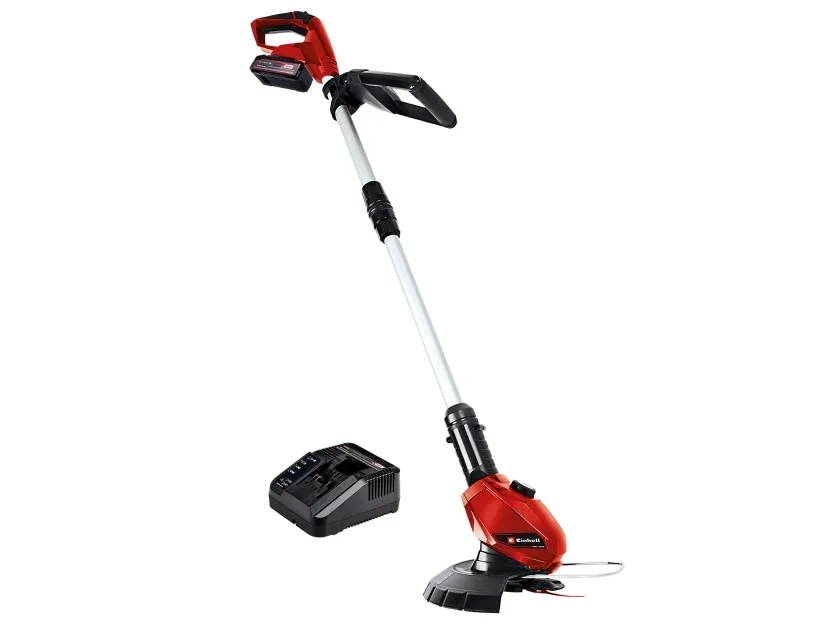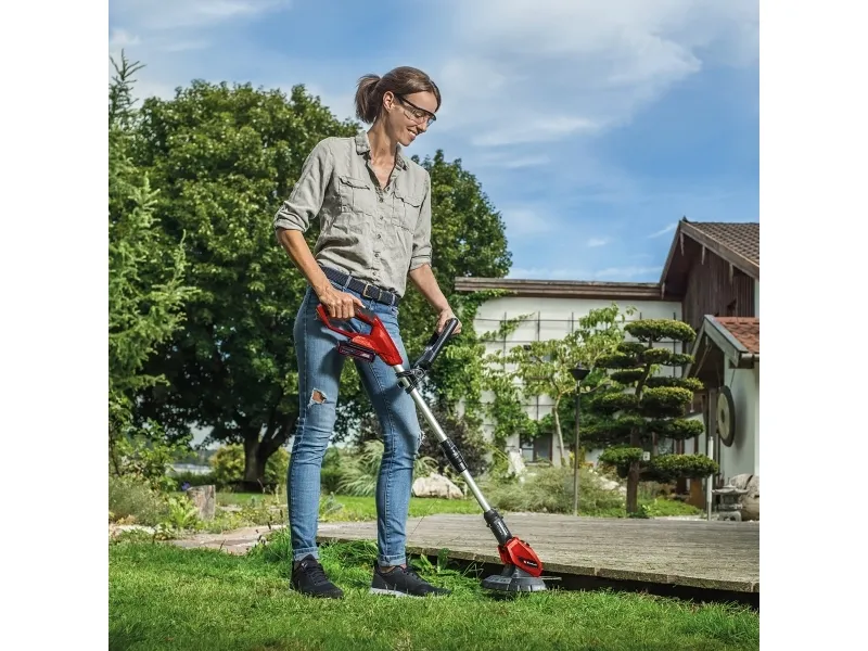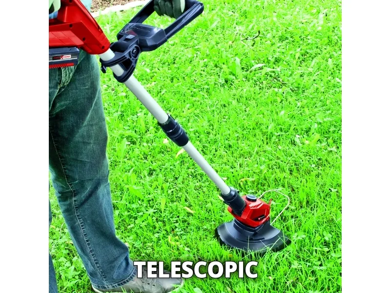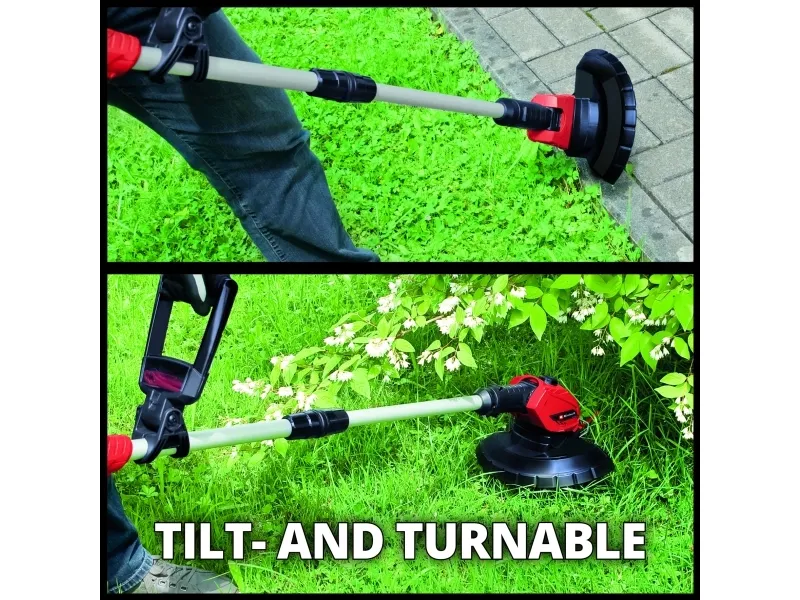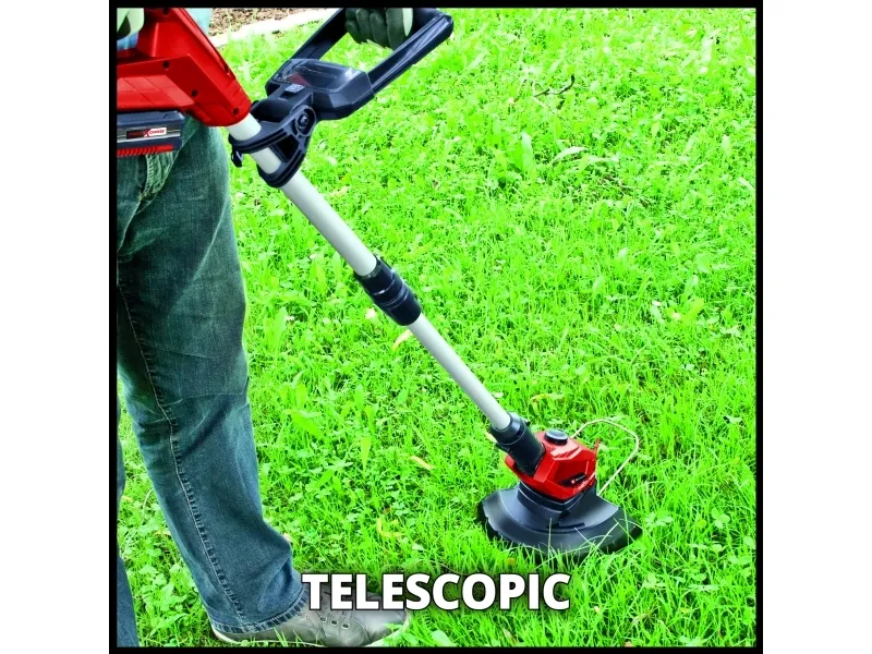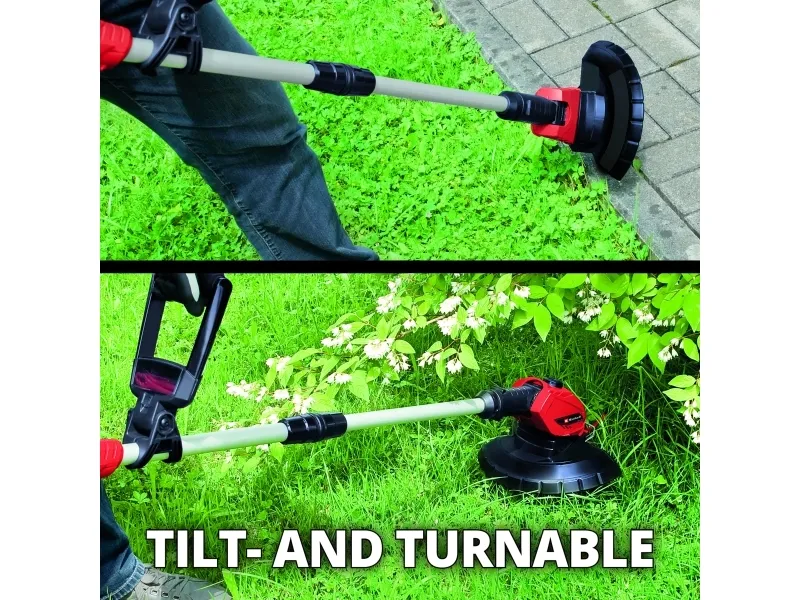 Einhell Power X-Change batteridrevet plænetrimmer GE-CT 18 Li (1x 2,5 Ah) Medlem af Power-X-Change familien, 1 x 18 V-batteri er nødvendigt Trinløst justerbart ekstra greb Trinløst teleskopføringsskaft Motorhoved +/- 90° drejeligt: Til lodrette flader/plænekanter 5 x vipbar motorhoved til fleksibelt arbejde Flowerguard beskytter planter og træer mod skader Softgrip til komfortabel håndtering Integreret opbevaringsrum til 20 knive Batteri-plænetrimmeren GE-CT 18 Li (1x 2,5 Ah) er et effektivt apparat, som sørger for en velplejet græsplæne over alt, hvor græsslåmaskinen bruges. Som medlem af Einhell Power X-Change familien kan trimmeren anvendes trådløst til udvidede arbejdsopgaver, der ikke er afhængige af en strømforsyning. Græstrimmeren leveres i praktisk sæt med et 2,5 Ah Power Power X-Change batteri og en oplader. På batteri-indikatoren med tre LED'er kan den aktuelle ladetilstand aflæses på et øjeblik. Den trinløse teleskopstyring på plænetrimmeren tilpasser sig enhver kropshøjde og sørger for en komfortabel håndtering. Takket være softgrip, trinløs indstilling, ekstra håndgreb med integreret knivrum til 20 knive og det +/- 90° drejelige samt 5 gange vipbare motorhoved kan også svære arbejdssituationer som om lodrette flader og græsplænekanter nemt og bekvemt håndteres. Enheden er udstyret med en Flowerguard til beskyttelse af blomster, planter og andre følsomme objekter.