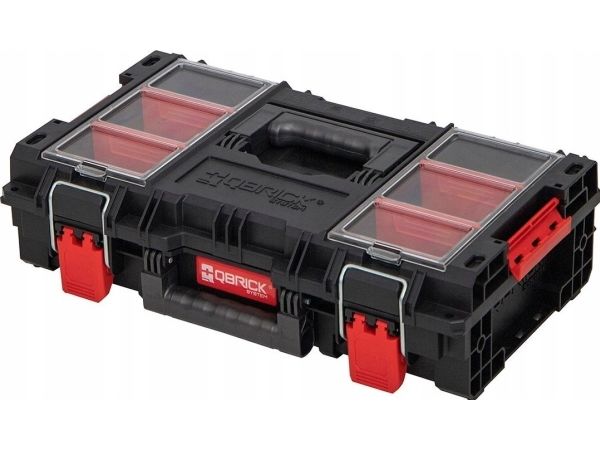 QBRICK SYSTEM PRIME - NEW TOP LINE WATER & DUST GASKET - IP66 RATED EXTRA ANTI-SHOCK CONSTRUCTION POLYAMIDE LATCHES & CONNECTORS 2 x CAPACIOUS ORGANIZERS ON THE LID 2 x LARGE BINS WITH ADJUTABLE DIVIDERS 2 x ERGONOMIC HANDLE