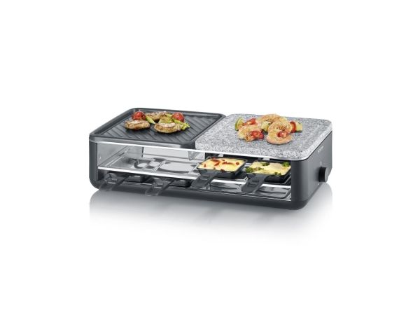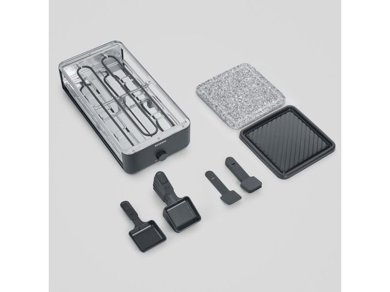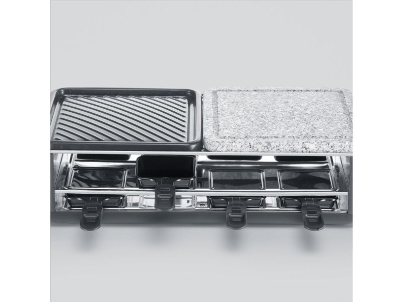 Bjud in dina vänner till en mysig middag med raclette som huvudattraktion. Låt era smaklökar dansa av glädje när ni fyller de små raclettepannorna med era personliga favorittillbehör och njut av den underbara kombinationen av smaker och dofter. Medan osten smälter och gratineras i pannorna, kan ni samtidigt njuta av att steka köttet på grillplattan som har en keramisk beläggning. Denna modell har den nya smarta parkeringsytan där du enkelt kan ställa de pannor som du inte använder för stunden.