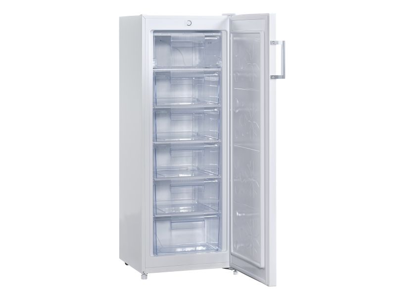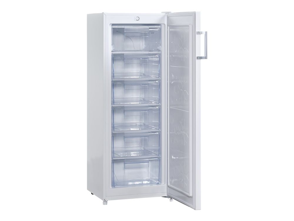 Praktisk fryseskab med 177 liter kapacitet og statisk frys. Fryseskabet har en god størrelse til de fleste husholdninger og er ideel som supplement til at opnå ekstra frysekapacitet, hvis et køle-/fryseskab ikke længere er nok i husstanden. Fryserens øverste hylde har en fryseklap og under den er der fem transparente fryseskuffer. Det fritstående fryseskab kommer med justerbare fødder, så det kan stå plant på alle underlag. Skabsdøren åbnes til højre, men døren kan også vendes, dermed er skabet fleksibelt at placere i alle rum.