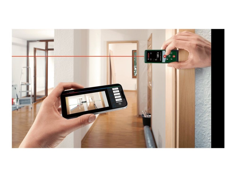 Previous measurement, work with Bosch MeasureOn application, Bluetooth, område og volummålinger, addisjons- og subtraksjonsmål, min/max measurement, 635 nm-laser, 0.5 s rated measurement time, automatic power off (5 min)