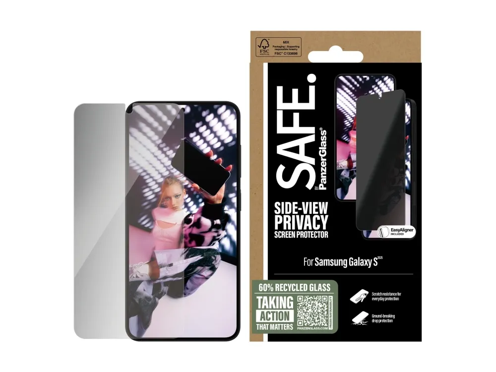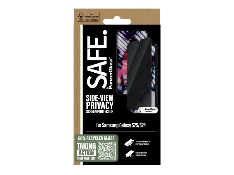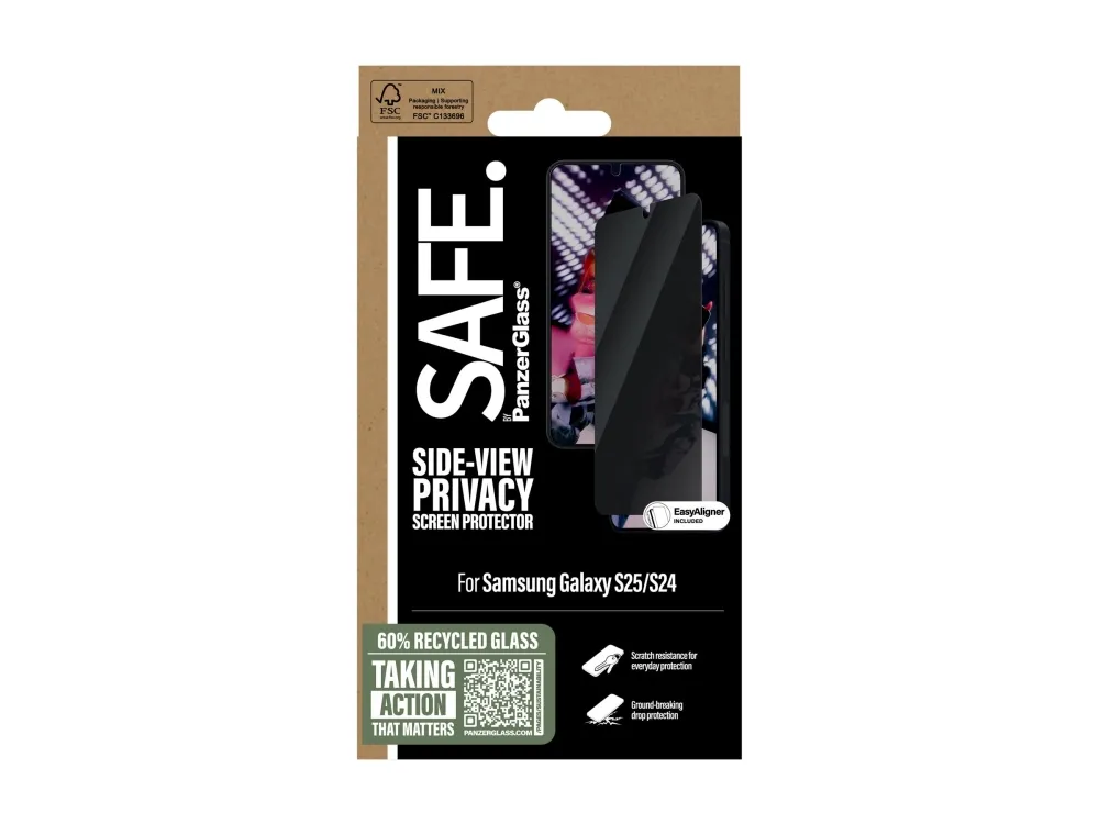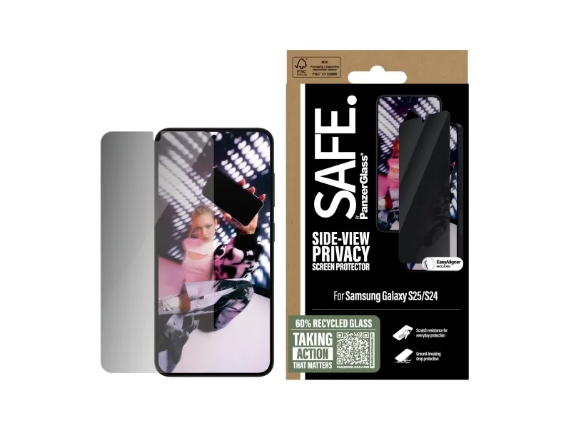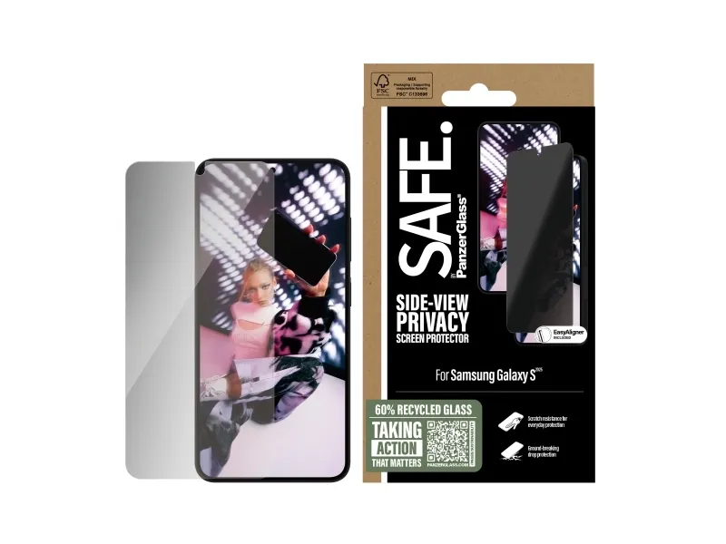 Everyone deserves to be SAFE.! You, your phone, and your private stuff! With this SAFE. by PanzerGlass privacy screen protector made of 60% recycled glass, your on-screen secrets are safe from nosy neighbours next to you on the train, in the bar or in class. The privacy filter makes the content of your screen virtually invisible to everyone except the person right in front of the screen: YOU! The glass even has a smudge-free coating that reduces traces of fingerprints and grease. And the screen protection? Well, let's put it this way: You no longer need to worry about dance floor mishaps, selfies gone wrong and your everyday fumbling, dropping and screen cracking!  Can you feel it? Love is in the air. Love for phones and the planet. It's the new circle of phone life. When you keep your beloved phone SAFE., you can one day pass it on to another phone lover who will love it just as much as you do. Choose SAFE. and give your phone a second, third or fourth life! This is one way of working toward a more sustainable future! Another is to use more sustainable packaging. So, of course, this product comes in a recyclable FSC-certified box. It should be EASY to be SAFE.! Without hassle, red tape, or unnecessary complexity! This screen protector comes with an EasyAligner that makes installation a piece of cake (seriously!) and to make it even easier, we've included step-by-step instructions as well as a QR code for quick access to our online how-to video. And remember: You just need to install the screen protection once! Then you'll never again fear the sight of your phone tumbling to the ground screen first. This may not happen, but if it does, you'll regret not having clicked "add to cart".  No screen protection is worth poor screen performance! That's why this screen protector comes in Ultra-Wide Fit, meaning it covers the front surface of your phone, providing a complete and crystal-clear view of your screen. It even leaves a little room around the edges for a case from CARE by PanzerGlass . And if you want to be extra SAFE., combine the screen protector and case with a SAFE. by PanzerGlass camera lens protector. Keep your phone SAFE.