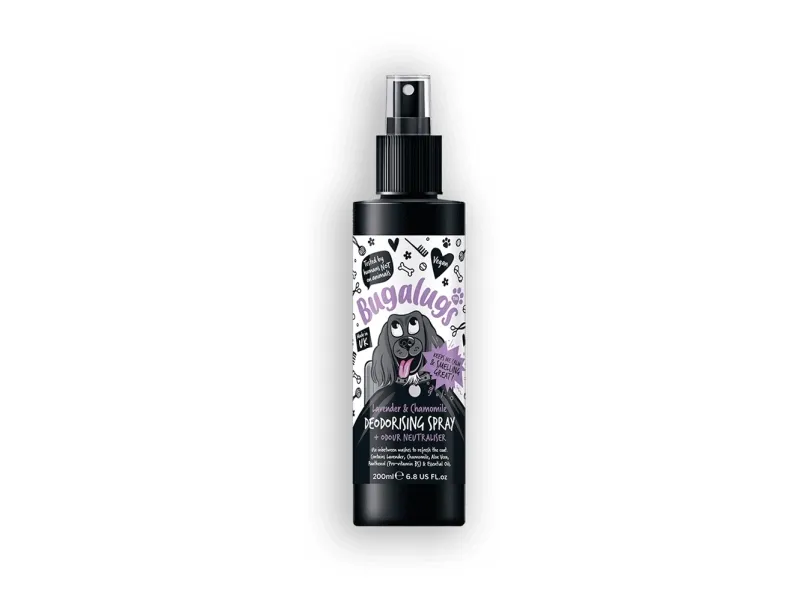 Bugalugs Lavender & Chamomile Dog Deodorising Spray with Odour Neutraliser fjerner hurtigt uønskede lugte, har en langvarig effekt og er nem at bruge – bare sprøjt og gå! Den giver din hund den professionelle salonduft, du elsker.