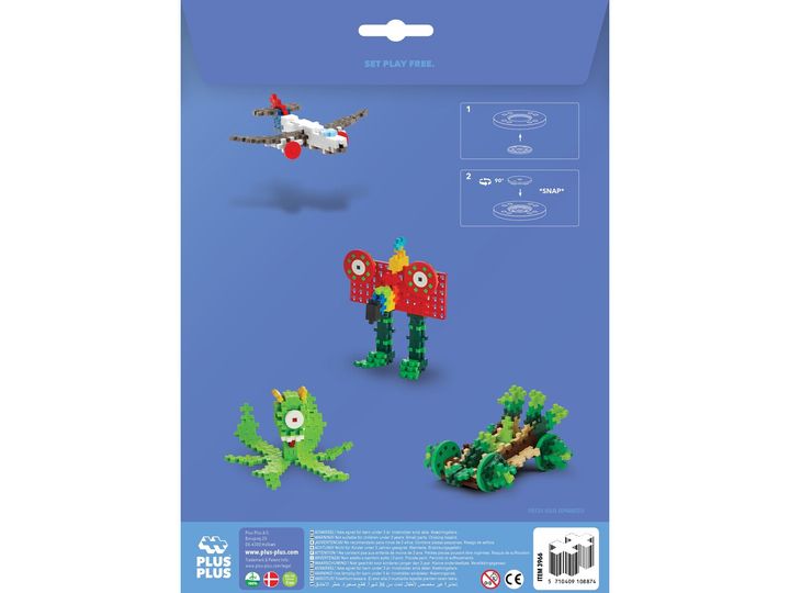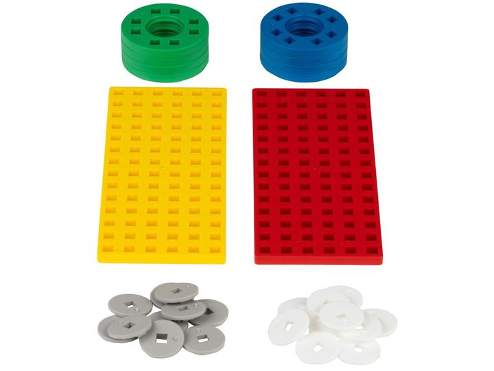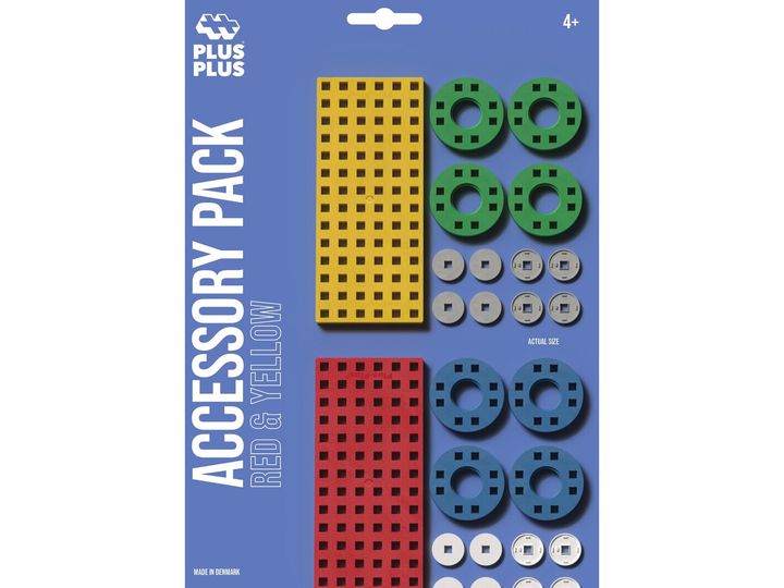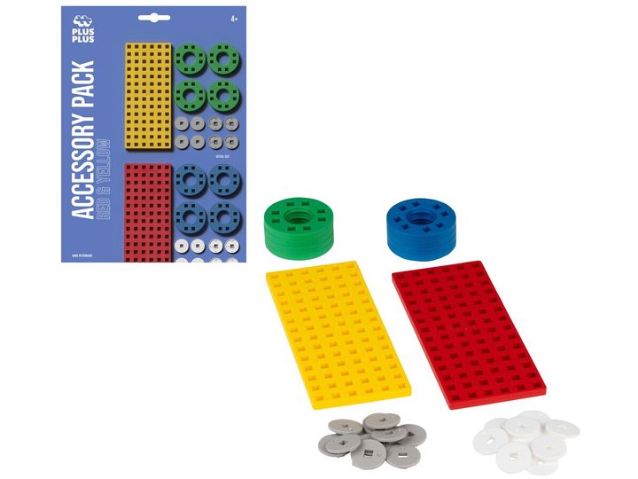 The baseplate and wheel mix comes with 2 small baseplates, 8 wheels to assemble with the choice of hubs and additional 4 hubs to play with making funny characters with your Plus-Plus. The accessory Pack is packed in a paper envelope.
