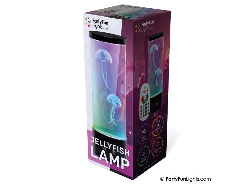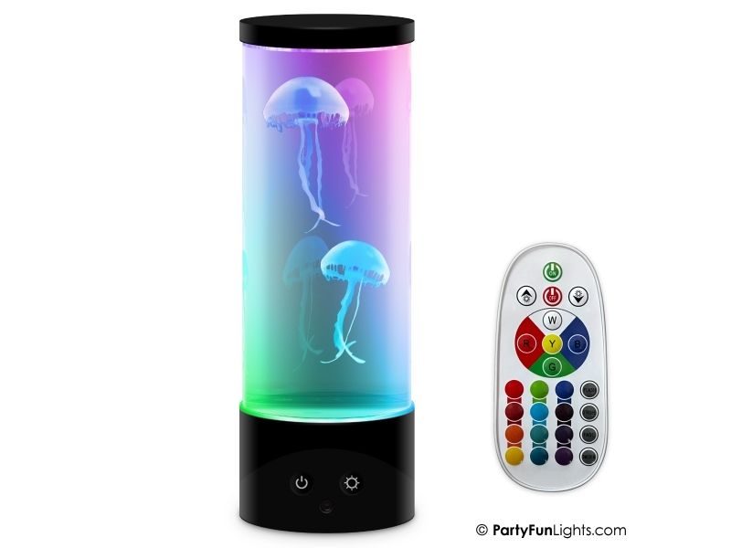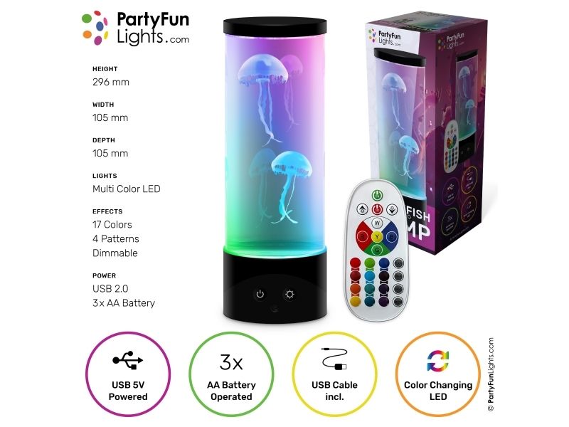 Skab en levende og afslappende akvariestemning til ethvert værelse med denne gople lampe. Den 30 cm høje lampe har farveskiftende LED'er. forskellige belysningstilstande. 2 medfølgende vandmænd og fjernbetjening. Tilslut blot lampen med det medfølgende USB-kabel og se goplerne svømme beroligende op og ned i lampen. Perfekt som dekoration i stuen. på børneværelset eller på kontoret. Lampen kan også anvendes med 3 stk. AA batterier (medfølger ikke). Fjernbetjeningen bruger 2 stk AAA batterier (medfølger ikke).