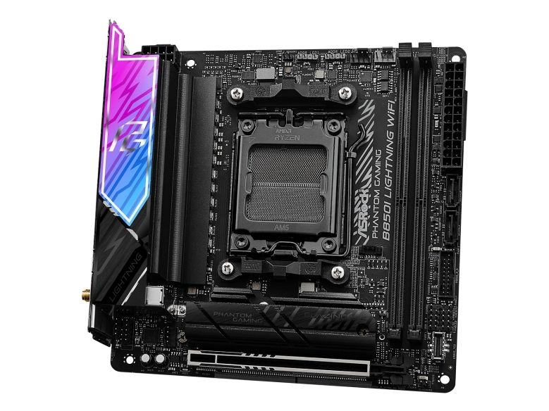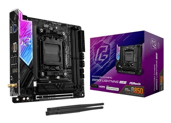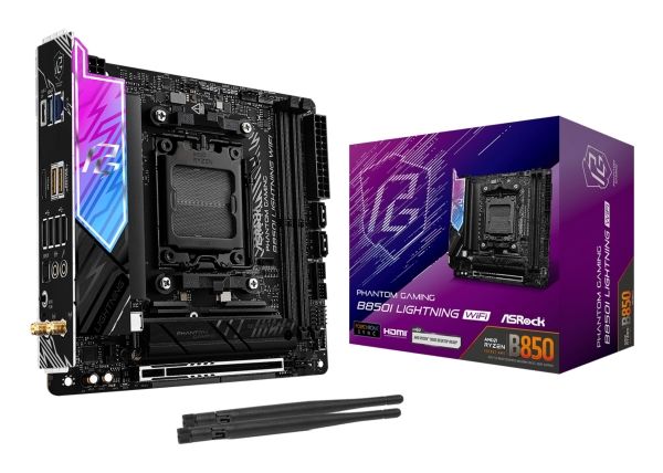 The ASRock Phantom Gaming B850I LIGHTNING WIFI motherboard combines performance and advanced technology in a compact mini ITX form factor, making it an ideal choice for gaming and high-performance systems. Equipped with the AMD B850 chipset and Socket AM5, it supports Ryzen 7000/8000/9000 Series processors and features dual-channel DDR5 SDRAM capabilities, reaching speeds of up to 4100 MHz when overclocked. High definition audio support with the Realtek ALC1220 codec ensures a rich sound experience, while the intelligent layout promotes efficient airflow through an enlarged heatsink armor design. Connectivity is robust with support for PCIe 5.0 and PCIe 4.0, along with various USB types including USB-C 3.2 Gen 2. It also features a networking solution with 2.5 Gigabit Ethernet and Wi-Fi 6E capabilities for faster and more reliable Internet access. The motherboard incorporates ASRock’s Polychrome RGB lighting for custom aesthetic setups, and several user-friendly enhancements, like the BIOS FlashBack button and Nahimic Audio Enhancer, make system configuration hassle-free. This motherboard is engineered for DIY enthusiasts, offering reinforced PCIe slots and a pre-mounted I/O shield to ensure durability and ease of installation.