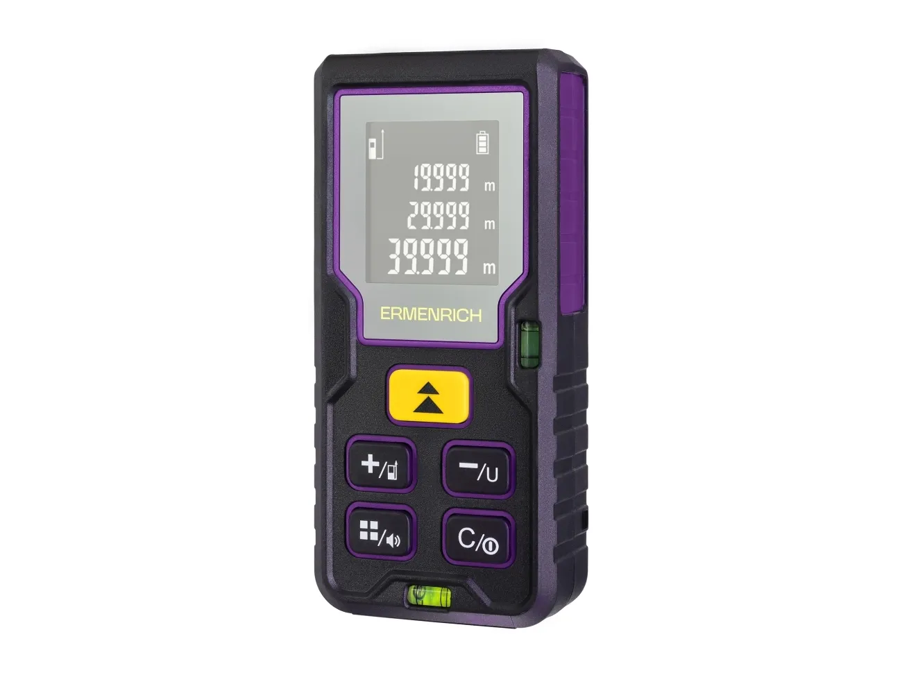 El medidor láser Ermenrich Reel PLUS GD100 es un dispositivo multifuncional para abordar una amplia gama de tareas en ingeniería mecánica y obras de construcción y reforma. Es especialmente adecuado para realizar mediciones de distancias, áreas y volúmenes en habitaciones grandes, de hasta 100 metros de lado. Además de mediciones individuales, también puede tomar mediciones automáticas continuas de una habitación. Los datos se muestran en la pantalla LCD de 3 líneas y se pueden almacenar hasta 20 grupos de resultados simultáneamente. Es posible manejar el aparato sin recibir alertas sonoras.
