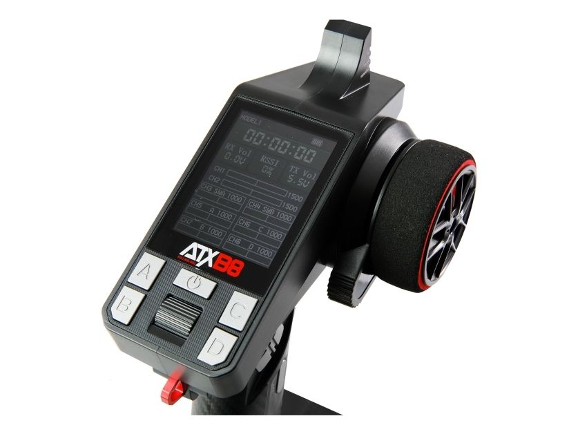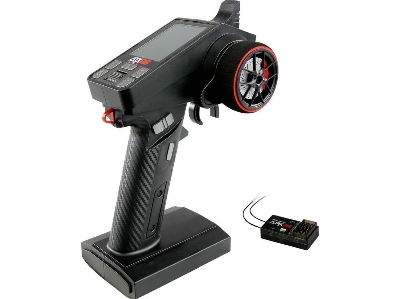 8-kanals pistolfjernstyring ATXB8 giver mange funktioner og er nem at betjene. Alle kanaler kan programmeres, der er en hukommelse til op til 8 modeller samt et stort farvedisplay, der giver et klart overblik. Derudover har fjernstyringen blandingsfunktioner til diverse kanaler, for at muliggøre en fleksibel styring. En integreret telemetrifunktion viser modellens batterispænding eller modtagerstrømforsyningen i realtid direkte på displayet. Yderligere praktiske funktioner omfatter en dobbelt-rate-indstilling for gas og styring samt mulighed for individuelt at tilpasse serverretningen for alle kanaler. For en nem enhåndsbetjening er der integreret en ekstra arm på rattet. Via USB-C-tilslutningen kan systemet nemt opdateres eller for eksempel anvendes til simulatorer. Betjeningen af fjernstyringen sker via gas, styring, en trykknap på grebet (SWB), en tre-vejs kontakt via grebet (SWA) samt fire knapper på oversiden. Den digitale trimning gemmer alle indstillinger vedvarende, også når fjernbetjeningen bliver slukket og tændt igen. En anden sikkerhedsegenskab er den automatiske slukkefunktion, der aktiveres efter 15 minutter uden indtastning. Senderen udsender et minut før en tone, før den slukker for at skåne batteriet. En ekstra funktion er et integreret racerspil tilgængeligt, som styres via styring og gas på fjernbetjeningen, mens displayet fungerer som skærm til spillet.