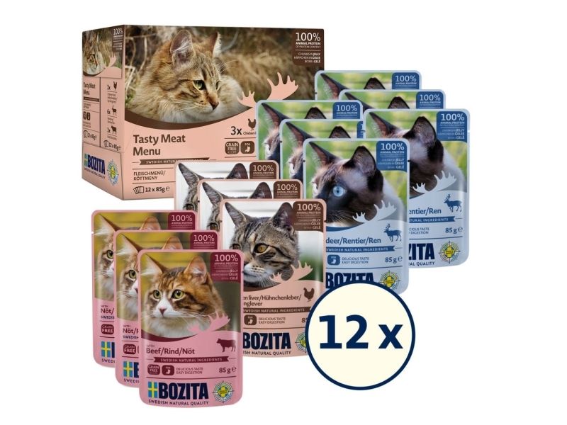 Köttmeny med bitar i gelé är fylld med tolv praktiska portionsförpackningar i tre utsökta smaker. Kycklinglever, ren och nöt är alla ett komplett balanserat foder för vuxna katter. Fodret är spannmålsfritt recept med 100% animaliskt protein av proteininnehållet. För en bra magflora innehåller fodret även prebiotiska FOS och har dessutom en naturlig balans av mineraler och vitaminer.