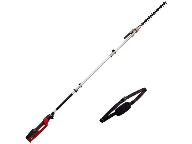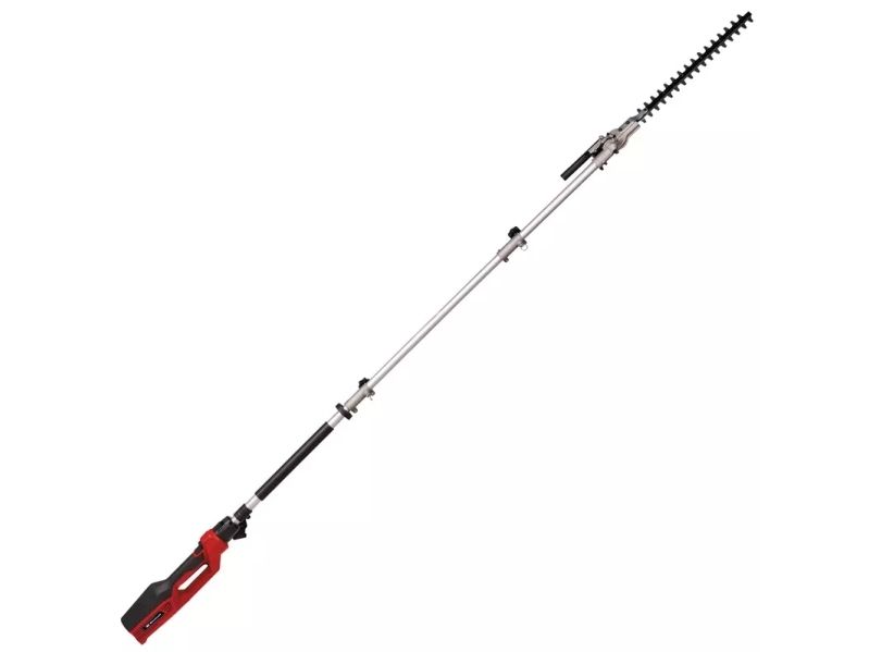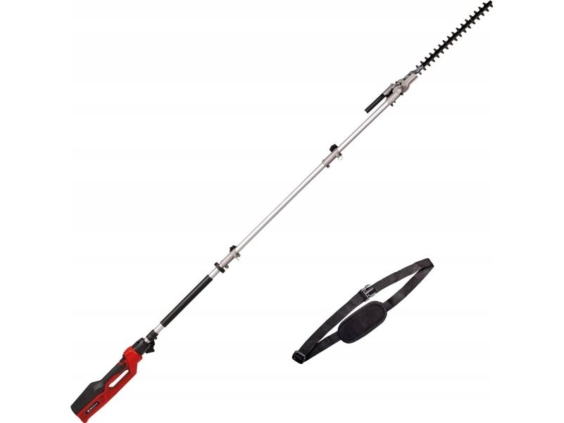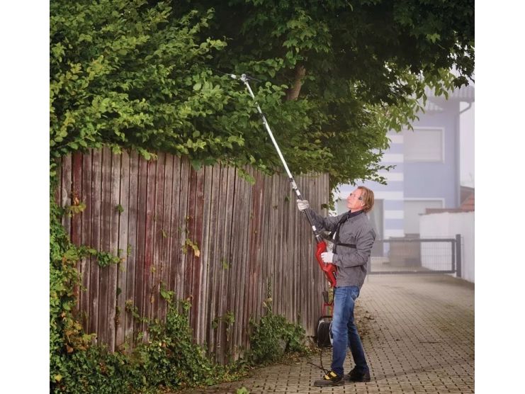 El-stav-hækkeklipper GC-HH 9046 Vippeligt skæreudstyr til optimale skæreresultaterKniv i laserskåret og diamantslebet stålStor tandafstand til skæring af tykke greneTeleskopforlængerDrejeligt hovedgrebMetaldrev for lang levetid Til den 900 watt stærke elektro-stav-hækkeklipper GC-HH 9046 er høje hække ingen udfordring. Med den kan høje hække sikkert afkortes fra jorden - helt uden rystede ledere. Teleskop-hækkesaksen er 1,97 m lang. Konstrueret som split-slip kan det medfølgende forlængerkabel monteres til en samlet længde på enheden på 2,6 m. Med en bladlængde på 46 cm og en skærelængde på 41,2 cm kan buske, hække og buske præcist formeres. Takket være den store tandafstand på 20 mm er også tykkere grene ikke noget problem med laserskårede og diamantslebne knive. Den elektriske teleskop-hækkesaks er udstyret med en robust metalgearkasse for en lang levetid. For at arbejde optimalt fra forskellige vinkler kan skærehovedet vippes 11 gange. Desuden kan det bageste håndtag drejes til lodrette og vandrette snit. Softgripfladerne og den justerbare bæresele med hurtig frigørelse sørger for en komfortabel håndtering. Til sikker transport og optimal opbevaring af langstel-hækkesaksen medfølger en holder til beskyttelse af kniven.