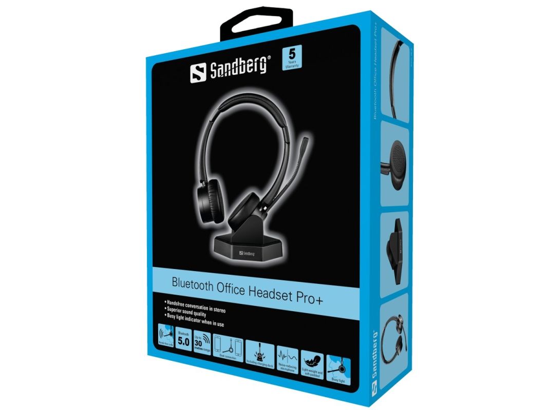 Sandberg Bluetooth Office Headset Pro+ is a stylish and exceptionally comfortable wireless stereo headset, optimized for use with a mobile phone or for online conversations on your PC. It ensures crystal-clear voice reproduction. The headset can be connected with two devices simultaneously; for example, both your PC and your mobile phone. With an integrated "busy" light-emitting diode, enabling your colleagues to easily see whether you are busy with a conversation in the headset. The package includes an elegant base, in which the headset can be recharged when it is not in use.
