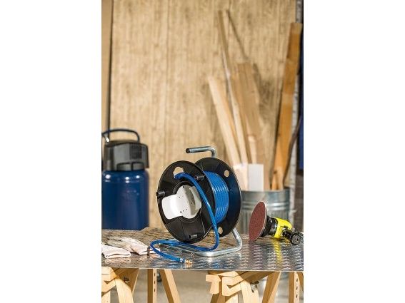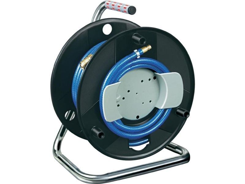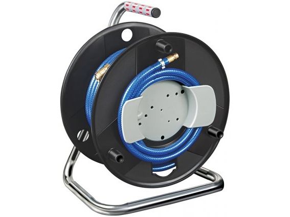 Med stofslange af høj kvalitet · Op til 15 bar driftstryk · Med snapkobling af metal til betjening med én hånd · Tromle af ekstra brudsikker specialplast · Stel af forzinket stålrør.