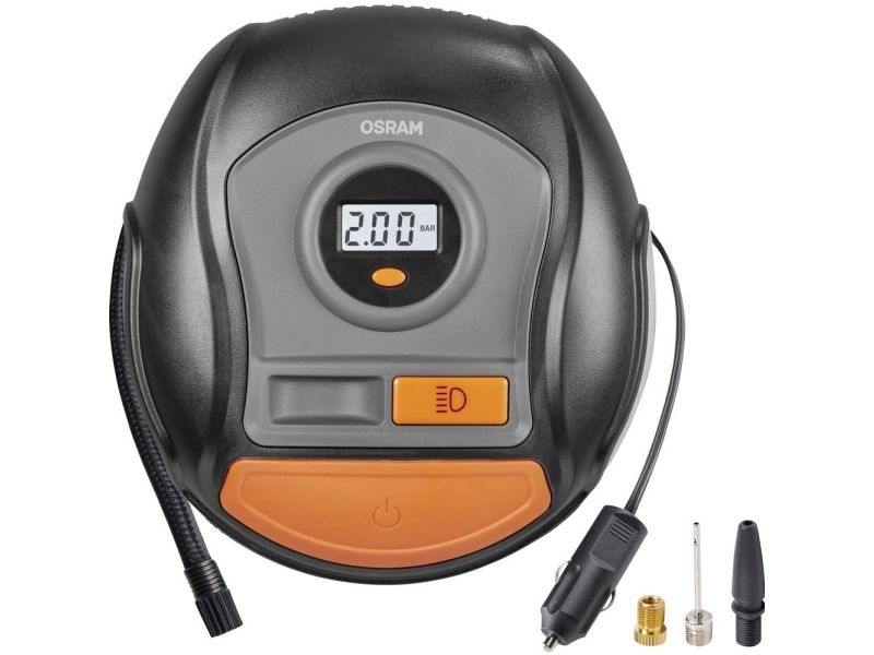 OSRAM OTI400 kan pumpe et plader dæk op på 3,5 minutter pr. minut). Med denne lave oppumpningstid er der brug for mindre tid til vedligeholdelse af dækket. Apparatet har et baggrundsbelyst digitalt display og hvidt LED-lys for maksimal belysning i mørke. OTI400's flade design stabiliserer apparatet under brug. Ved hjælp af det oprullende kabel undgås sammenfiltring af kablet, så du hurtigere kommer tilbage på vejen. Leveres komplet med tre-tredelt adaptersæt til cykeldæk, bolde og andre oppustelige genstande.