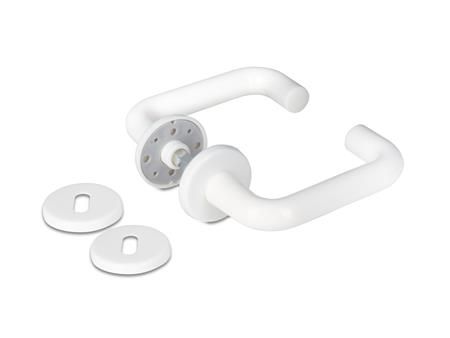 U-formet dørgreb i hvid med 6 mm click roset. Til indvendige døre. Inkl. nøgleskilte (Ø52 mm), skruer og bøsninger til montering.