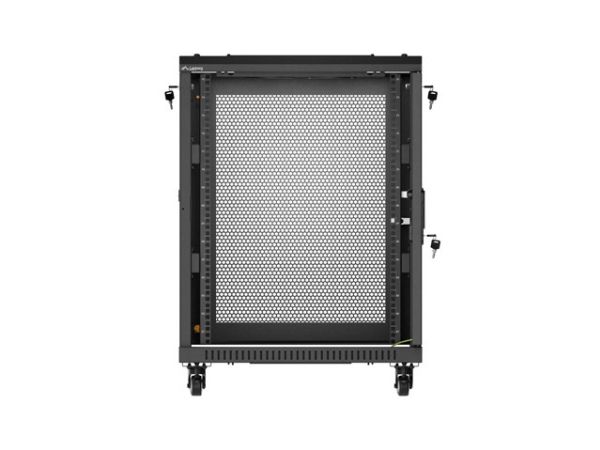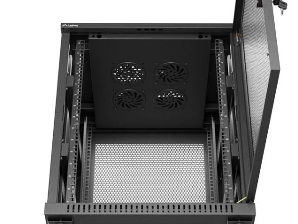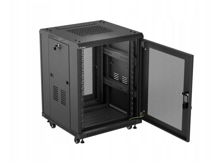 The Lanberg FF01 series rack offers a sturdy solution for organizing equipment in a secure environment. Its 19-inch rack size and 15 rack units provide space while maintaining a compact form factor. The rack features a flat pack design for easy transport and assembly, while the perforated front and rear doors enhance airflow with built-in cooling fans, ensuring optimal temperature management for mounted devices.