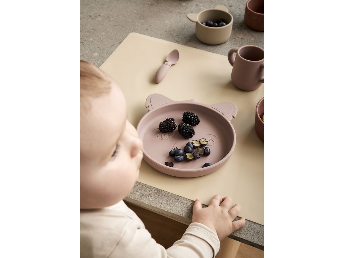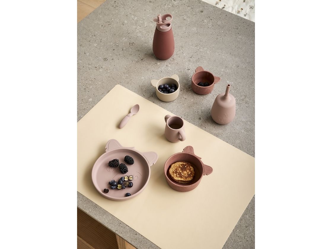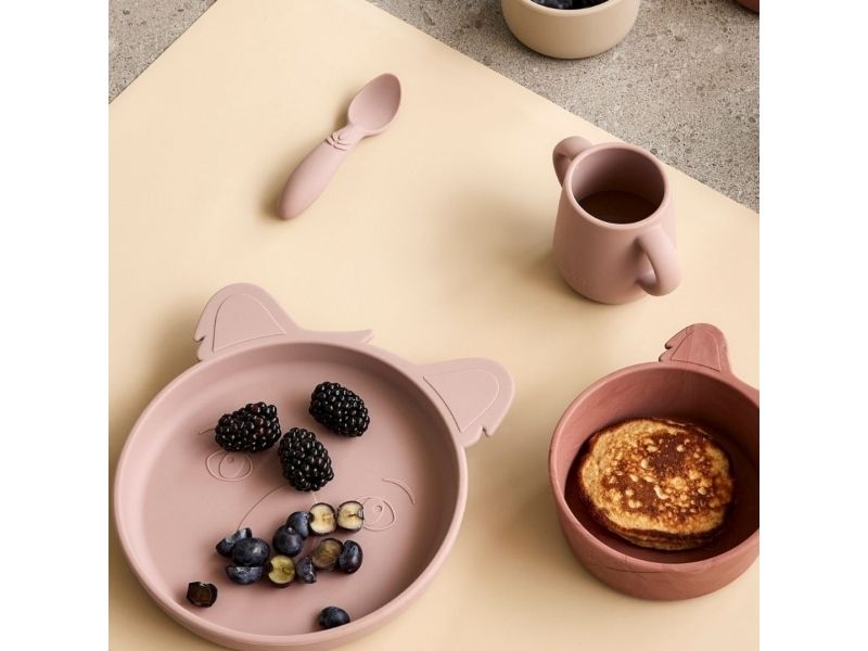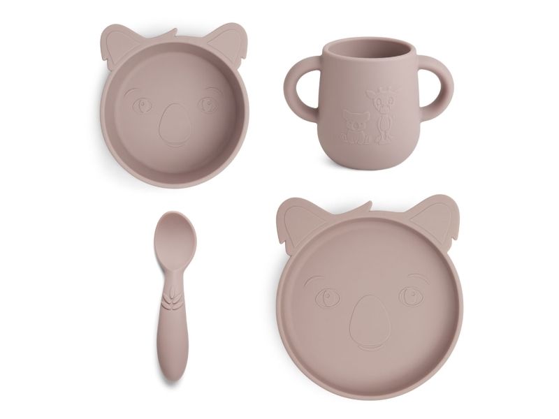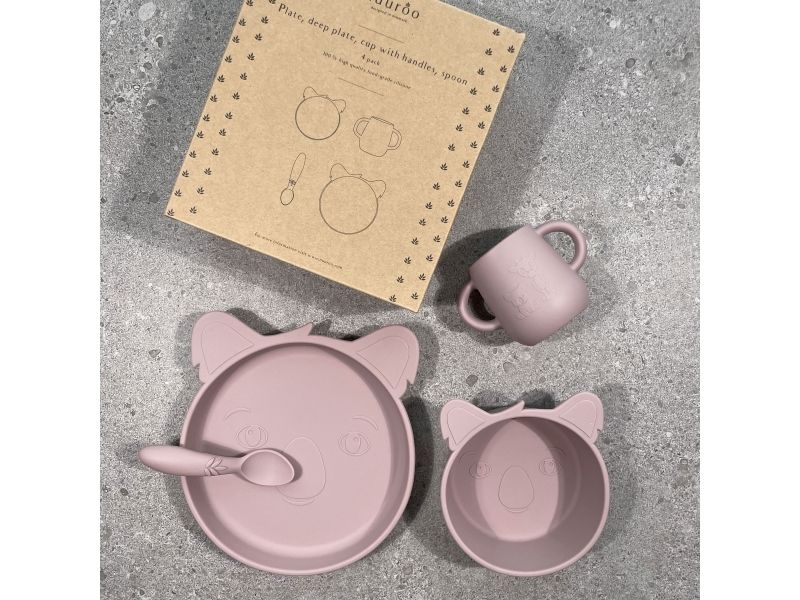 Fire af nuuroo's bedste serviceprodukter i LFGB silikone - samlet i et sæt. Dette set indeholder en tallerken, en dyb tallerken, en ske og en kop. Silikonen er uden nogen skadelige kemikalier, og er et godt alternativ til porcelænsservice da det ikke går i stykker hvis det bliver tabt på gulvet.