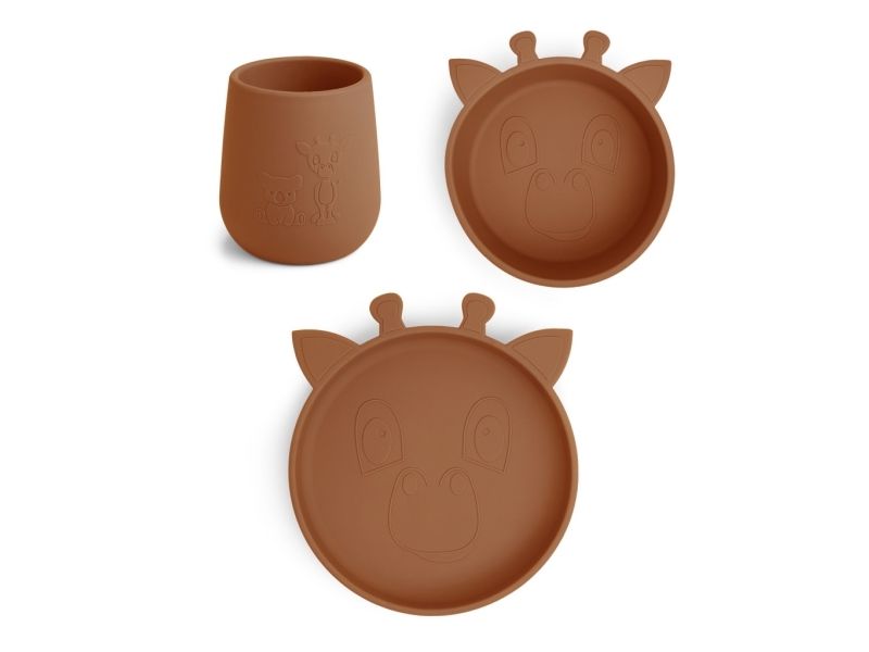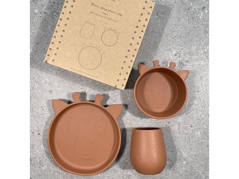 Tre af nuuroo's bedste serviceprodukter i LFGB silikone - samlet i et sæt. Dette set indeholder en tallerken, en dyb tallerken og en kop. Silikonen er uden nogen skadelige kemikalier, og er et godt alternativ til porcelænsservice da det ikke går i stykker hvis det bliver tabt på gulvet.