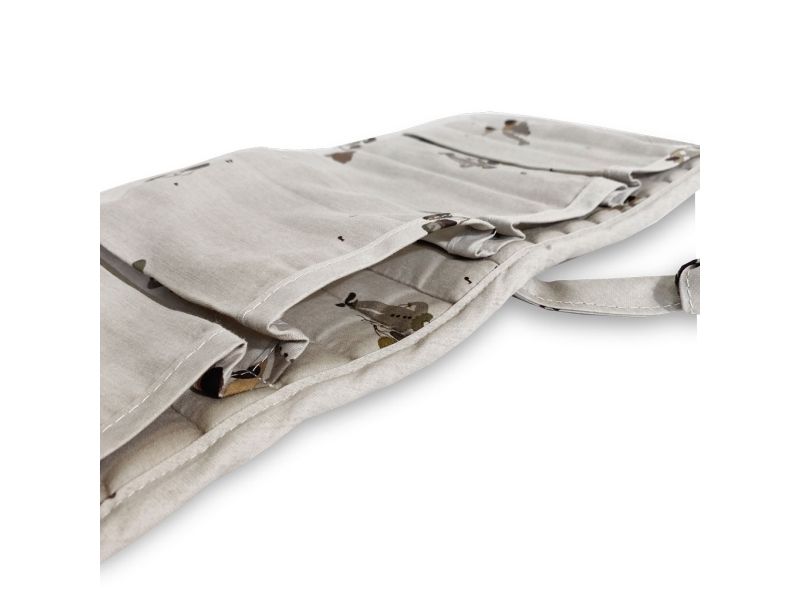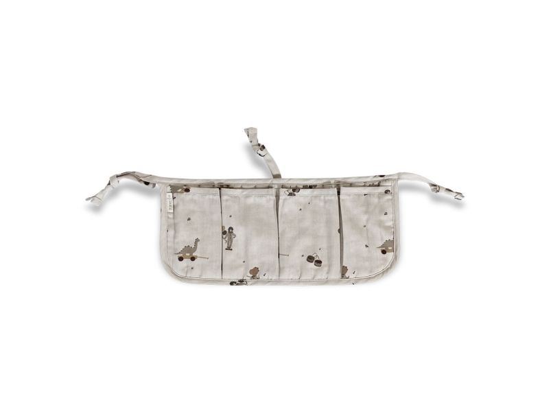 Praktisk sengelomme til at hænge på tremmesengen eller ved puslebordet. Sengelommen har fire rum til at ligge sutter, nusseklude og andre sengetidsnødvendigheder, så de altid er tæt på ved sengetid. Sengelommen bindes nemt på sengekanten med tre snørrer.