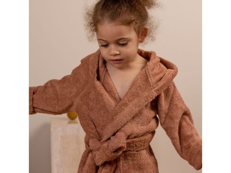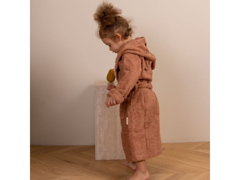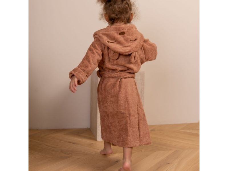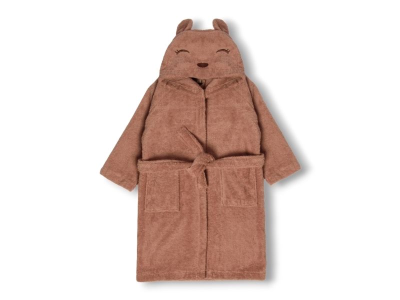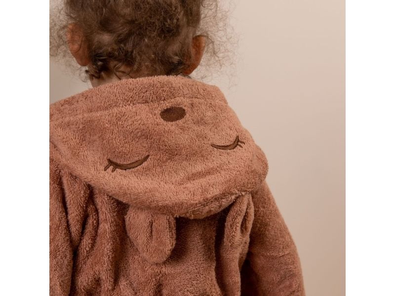 Blød Achaia badekåbe, der holder dit barn varmt og tørt. Badekåben er lavet i 100% økologisk bomuldsfrotté, og har et broderet dyreansigt og søde ører på hætten.
