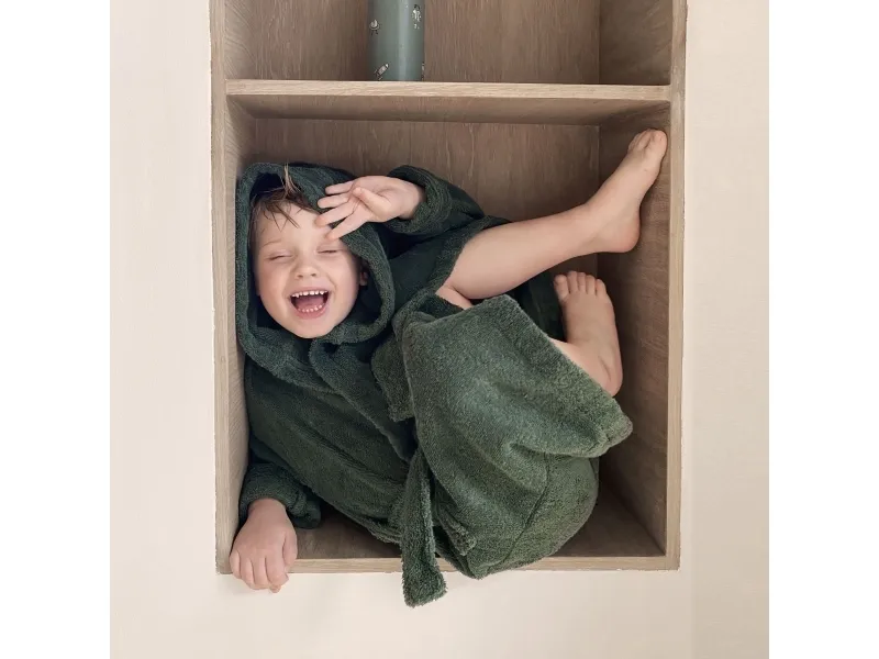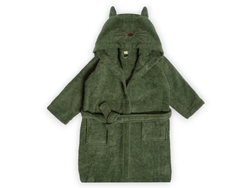 BADEKÅBE TIL BØRN I ØKOLOGISK BOMULD Blød Achaia badekåbe, der holder dit barn varmt og tørt. Badekåben er lavet i 100% økologisk bomuldsfrotté, og har et broderet dyreansigt og søde ører på hætten.