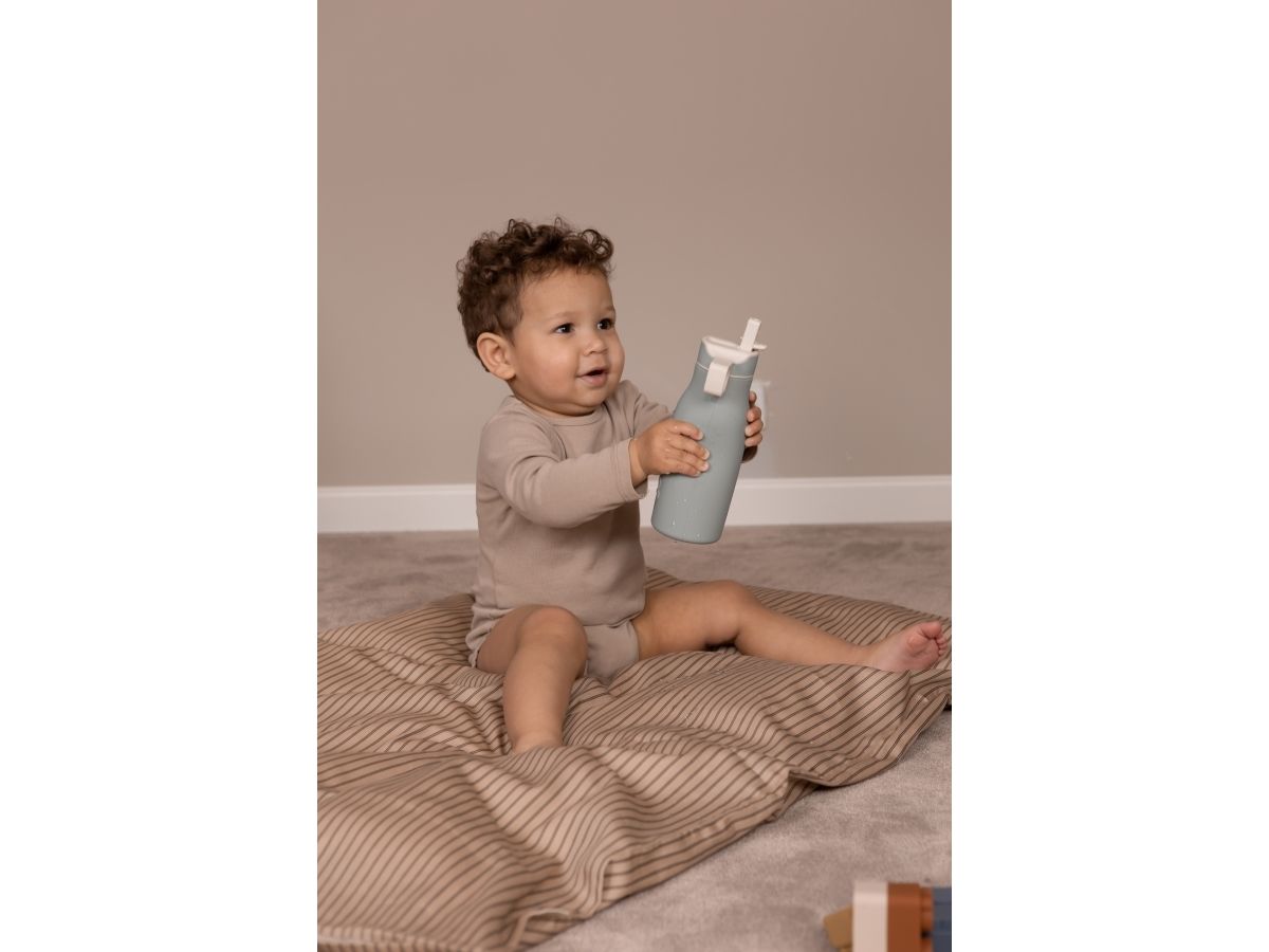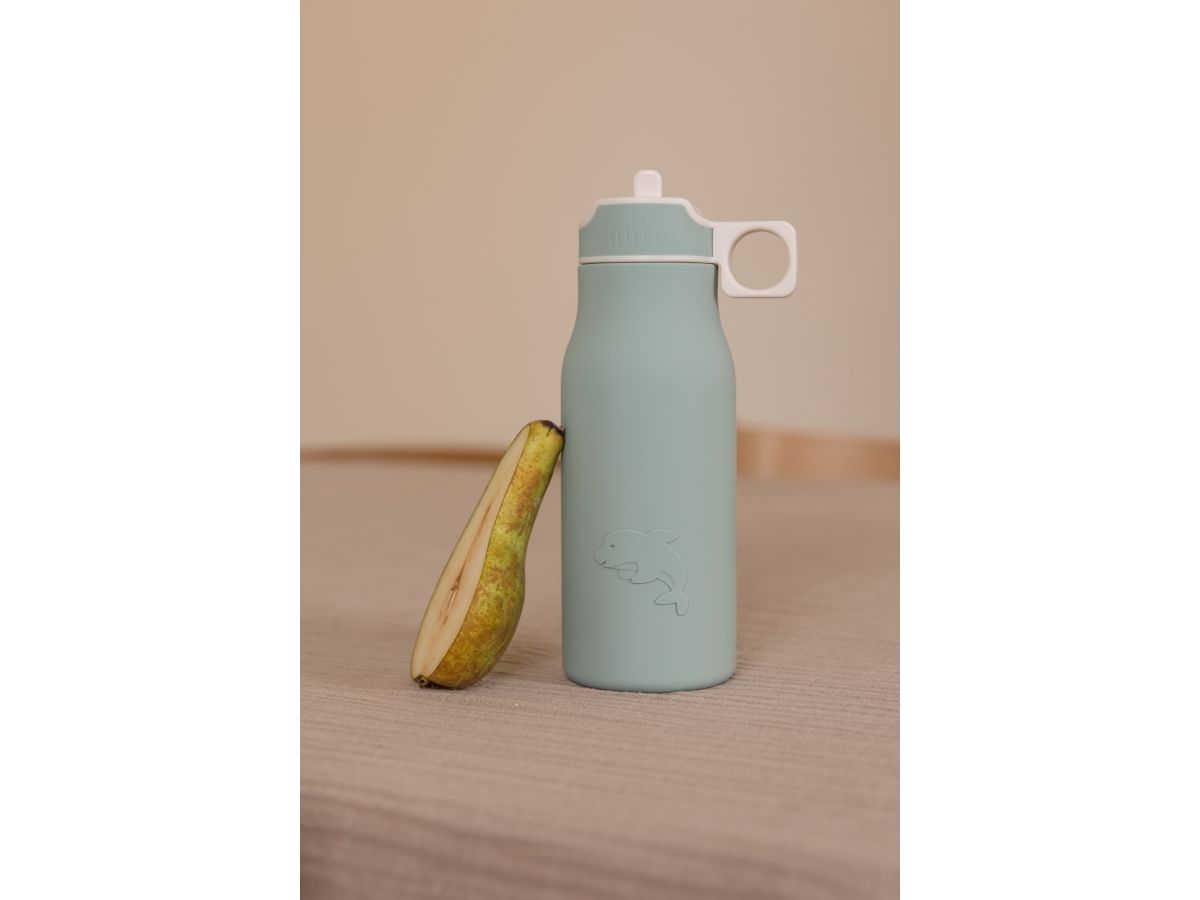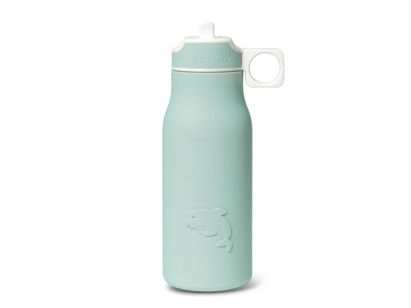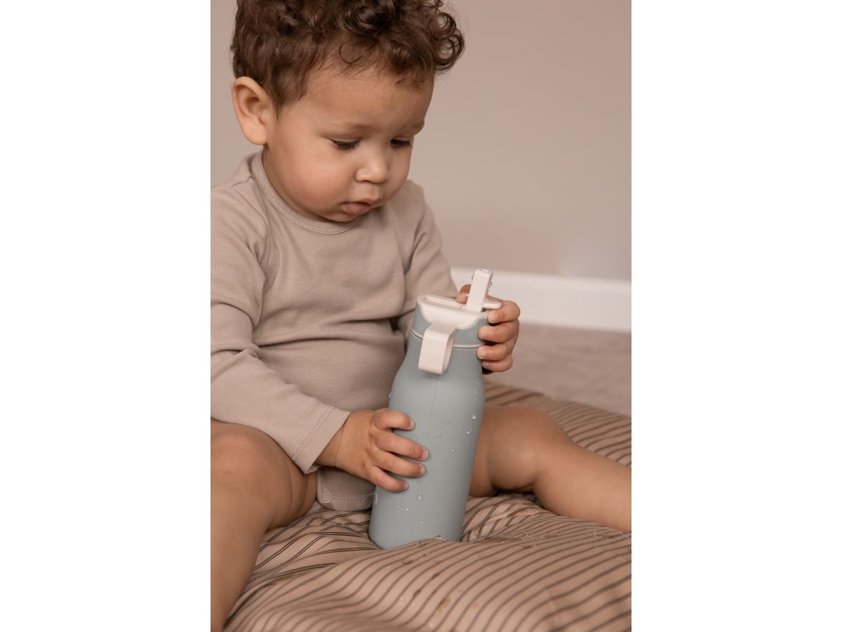 Lau drikkeflaske med sødt motiv. Flasken er lavet af 100% LFGB silikone, som er fri for skadelige kemikalier og godkendt til fødevarer. Låget er lavet af plast uden phthalater, og sidder tæt på flasken.