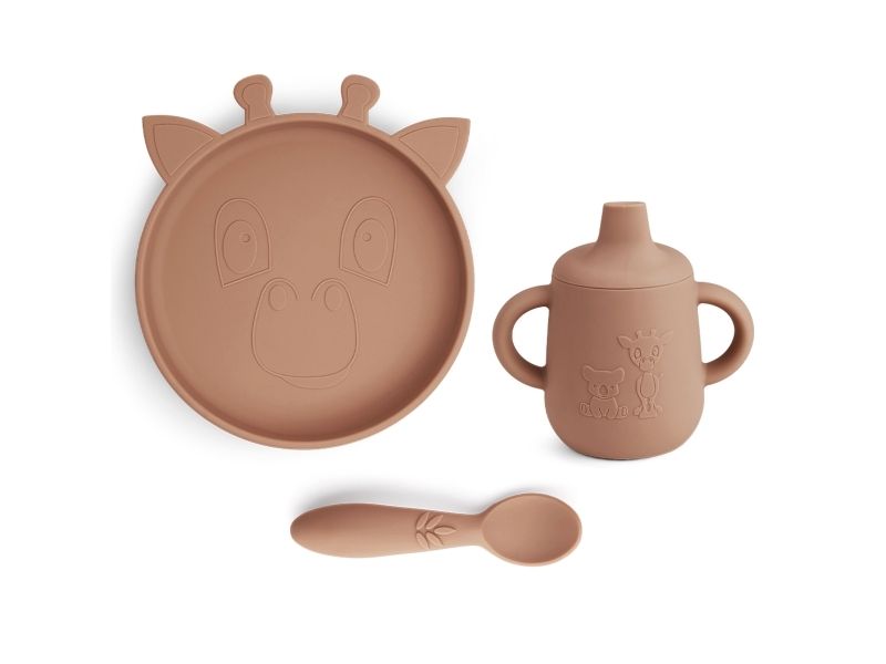Tre af nuuroo's bedste serviceprodukter i LFGB silikone - samlet i et sæt. Dette set indeholder en tallerken, kop med tud og en ske. Silikonen er uden nogen skadelige kemikalier, og er et godt alternativ til porcelænsservice da det ikke går i stykker hvis det bliver tabt på gulvet.