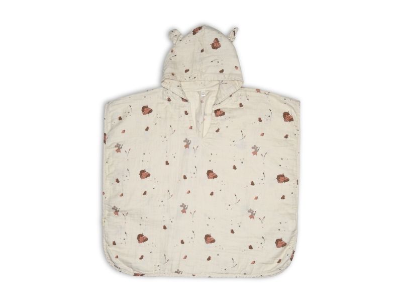 Super blød muslin poncho til de små. Let og luftig til de varme sommer dage. Lavet i økologisk bomuld musselin, hvis egenskaber gør at kåben tørre hurtig.