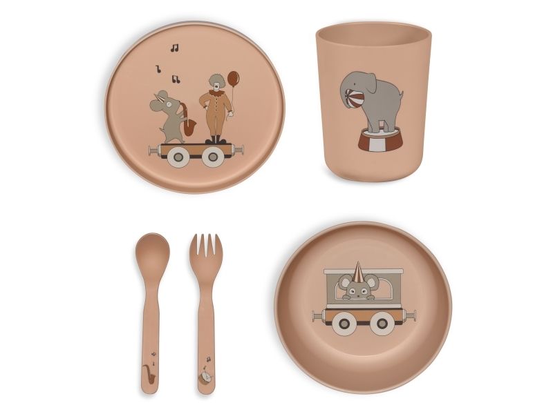 Mange PLA favoritter samlet i ét sæt. Sættet indeholder en tallerken, dyb tallerken, kop, ske og en gaffel. Det er godkendt til fødevarer og tåler både opvaskemaskine og mikrobølgeovn.