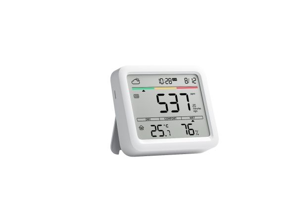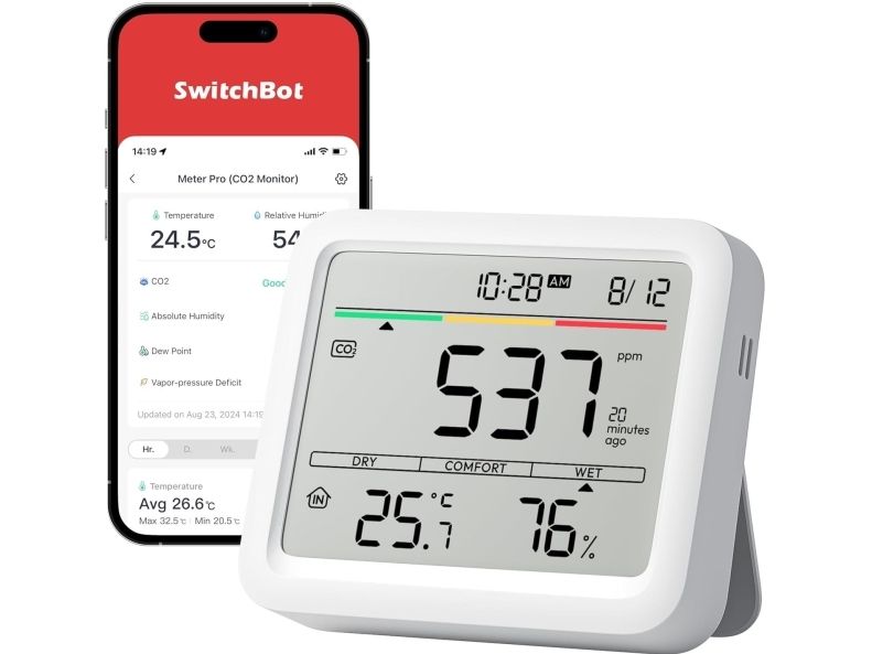6 IN 1 MULTI-FUNCTION SCREEN SwitchBot Meter Pro CO2 has a large screen that simultaneously displays CO2 levels, temperature, humidity, time, date, comfort level and weather forecasts (SwitchBot hub required). This makes it easy to monitor your environment and decide when to ventilate to create a healthier habitat. HIGH PRECISION SENSOR SwitchBot CO2 meter is equipped with Swiss industrial grade NDIR sensors and monitors air quality by measuring CO2 levels every 1 second with an accuracy of ±50ppm and a range of 400-9999ppm. Its high sensitivity and stability ensure fast and precise feedback on air quality. Multiple alarm methods: adjust the CO2, temperature and humidity range with trigger warnings. If the limits are exceeded, you will be notified of acoustic alarms, visual screen alerts and app notifications (SwitchBot hub required). So you can effectively monitor the air quality at any time. Part of the SwitchBot Ecosystem: With Hub 2, exceeding CO2 levels can automatically activate your battery circuit fan or evaporative humidifier for improved ventilation. Hub 2 also enables third-party voice control, simplifying air quality management. Portable & Durable Our air quality detector measures 3.6 x 3.1 x 0.9 and weighs only 5.4 oz. It has a built-in battery with a service life of up to 12 months and a low battery warning. It features wall mounting holes and an adjustable bracket for versatile placement in any environment.