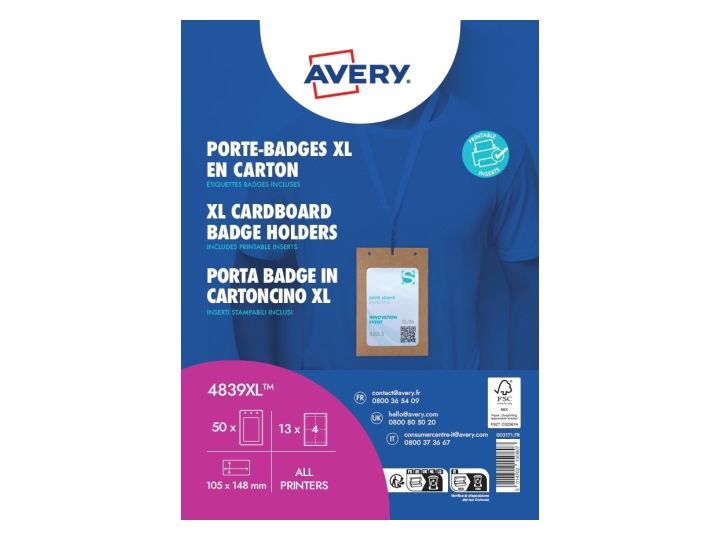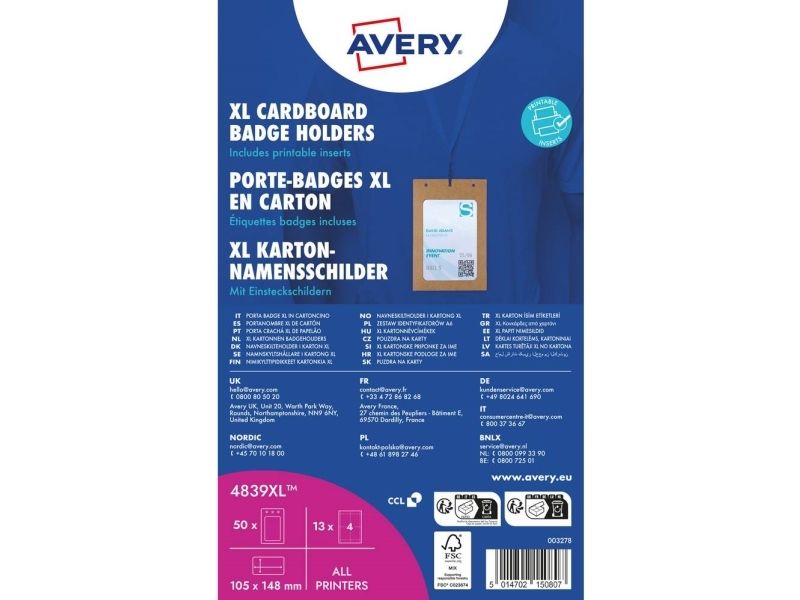De 50 bæredygtige navneskilteholdere 4839XL fra Avery fremstillet af 100% FSC®-certificeret papmateriale i stort A6-format 105 x 148 mm inklusive 52 indstik er ideelle til hyppig eller gentagen brug ved arrangementer, seminarer og konferencer.