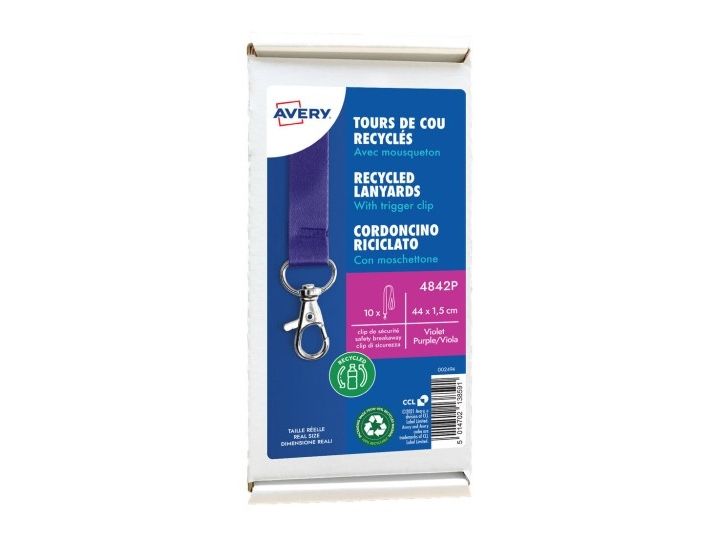 De lilla, 15 mm brede nøglesnore 4842P med en længde på 440 mm fra Avery er perfekte til konferencer, seminarer og enhver professionel eller privat begivenhed, men de er også ideelle som nøglering.