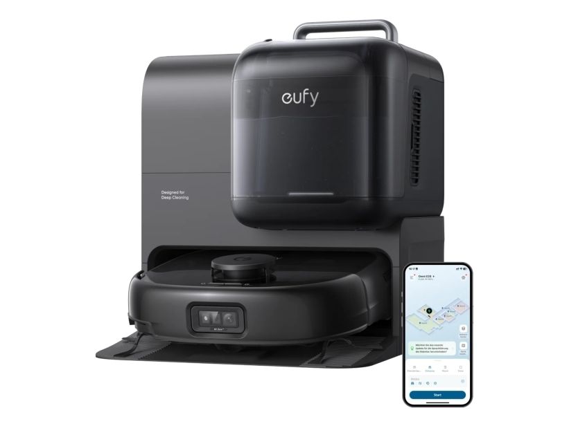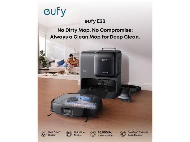 Eufy Omni E28. Product colour: Black, Shape: Other. Dust capacity (total): 3 L, Water tank capacity: 2.5 L, Base station functions: Charging, Purification. Battery capacity: 5200 mAh, Battery voltage: 14.4 V. Height: 111.8 mm, Width: 326 mm, Depth: 348.6 mm