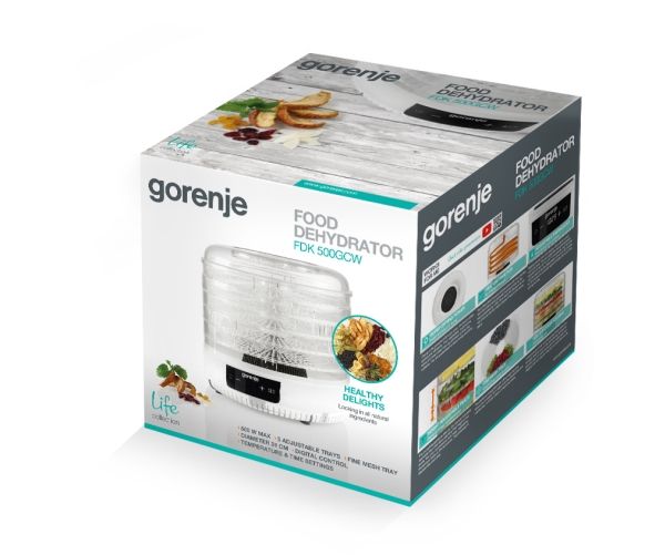 Gorenje FDK500GCW. Product colour: White, Housing material: Plastic, Stainless steel, Display type: LCD. Power: 500 W. Width: 310 mm, Depth: 310 mm, Height: 310 mm. Package width: 315 mm, Package depth: 315 mm, Package height: 320 mm