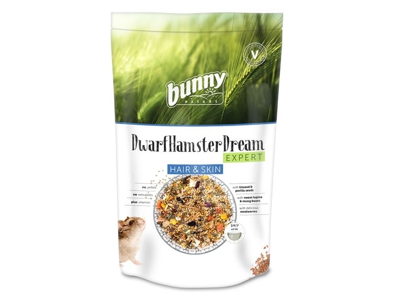 DwarfhamsterDream Expert Hair and Skin Dværghamstere kan godt lide at beskæftige sig med deres mad. Bunny Nature har derfor lavet DwarfHamsterDream EXPERT HAIR & SKIN med en afbalanceret og blomsterberiget opskrift og formel af foder til din lille hamster-ven - som måske også er lidt kræsen. Og med HAIR & SKIN gives der støtte til hud og hår.