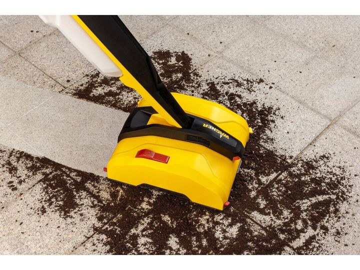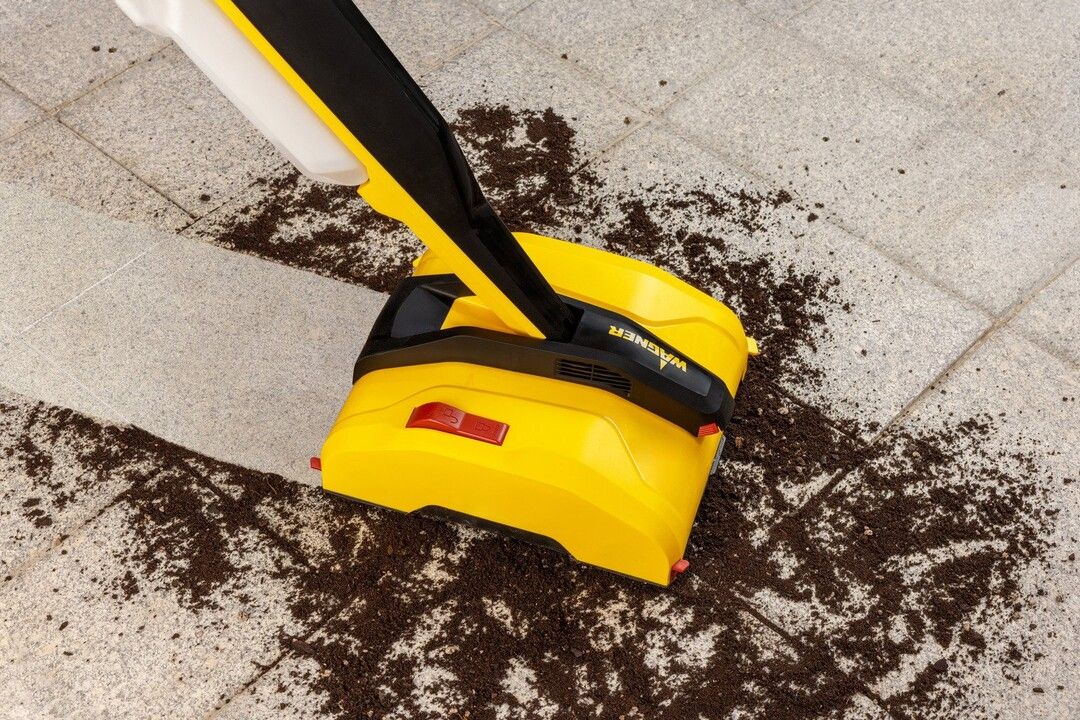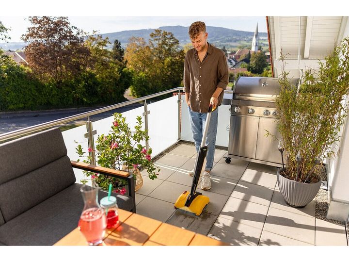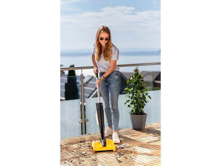 Tørr og fuktig skitt, som løv, sand, pottejord og fugleskitt, fjernes enkelt ved hjelp av de motroterende børstene og samles direkte i den avtakbare smussbeholderen. På denne måten unngår du kontakt med skitten, som lett kan kastes som vanlig husholdningsavfall. Den integrerte væsketanken og sprøytedysen gjør det mulig å øke rengjøringsytelsen ved å tilsette vann eller et rengjøringsmiddel.