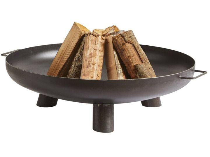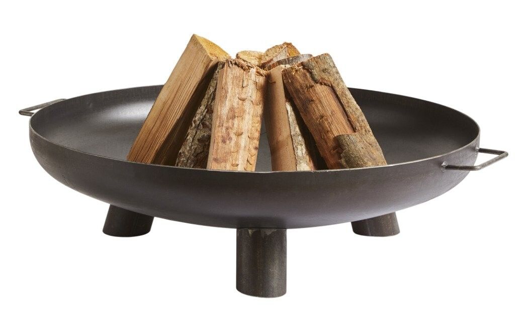 Hyggespreder til at varme sig omkring, lave snobrød og skumfiduser i haven. Klassisk bålfad, Ø70 cm, i 2 mm stål, 80 cm inklusive håndtag for bekvem håndtering. Det står på 3 stabile ben af metal, og måler 21,5 cm i højden. Produktet er sort-lakeret, og vil få en rust patina.