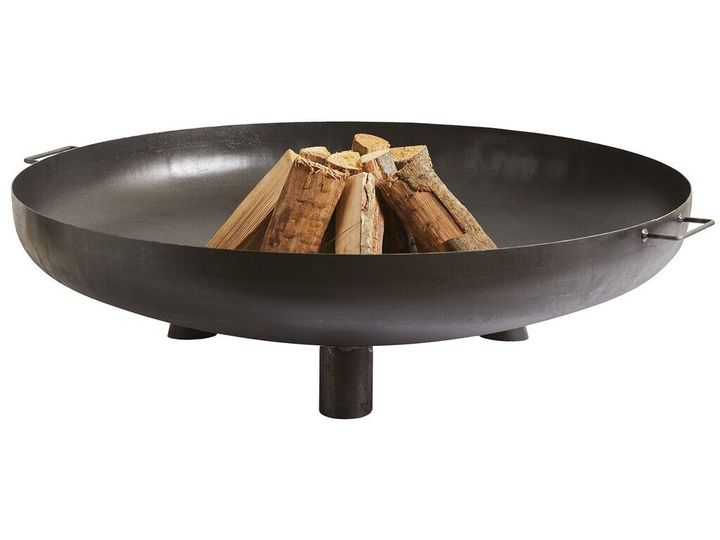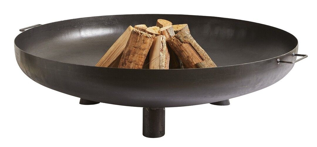 Hyggespreder til at varme sig omkring, lave snobrød og skumfiduser i haven. Klassisk bålfad, Ø100 cm, i 2 mm stål, 110 cm inklusive håndtag for bekvem håndtering. Det står på 3 stabile ben af metal, og måler 30 cm i højden. Produktet er sort-lakeret, og vil få en rust patina.