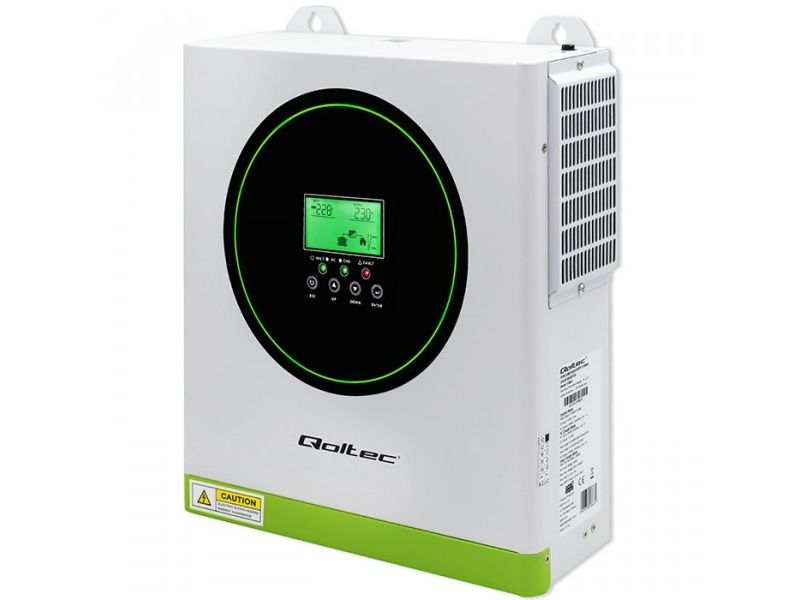 The Qoltec hybrid solar inverter is designed to deliver reliable power conversion with a maximum capacity of 3500 VA, ensuring efficient energy management. Operating between -10°C and 50°C, this power converter supports pure sine wave output, making it suitable for sensitive electronics and appliances. With features like an LCD display, MPPT charge controller, and multiple protection mechanisms including overheat, overcharge, overload, and short-circuit protection, it enhances safety and durability. Ideal for off-grid applications, this inverter maintains an efficiency rate of 94%, coupled with a quick transfer time of just 10 ms from grid to battery power.