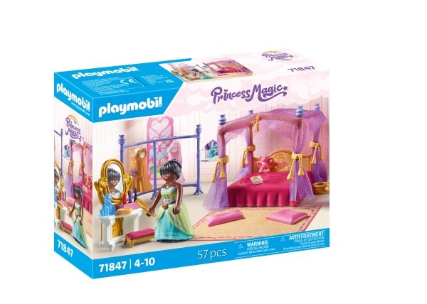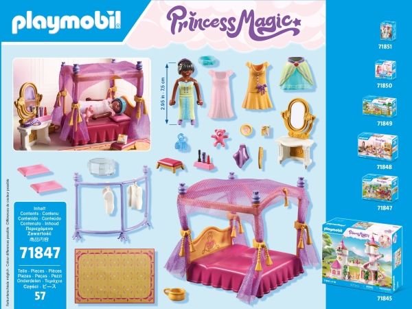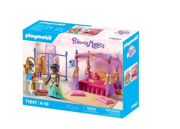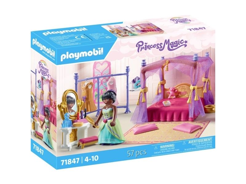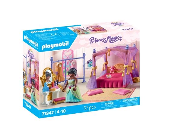Forvandl prinsessens dag med dette charmerende PLAYMOBIL soveværelses- og omklædningssæt! Skab smukke kongelige looks med de medfølgende makeup-accessories. Sengen med stofhimmel, en sød bamse til sengetid og et stilfuldt sminkebord danner rammen om endeløse eventyrlige lege. En skøn tilføjelse til Prinsesseslottet (produktnr. 71845), der inspirerer til fantasifuld leg for ægte royale drømme!