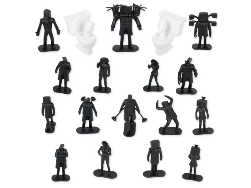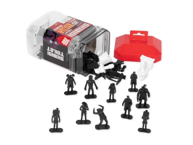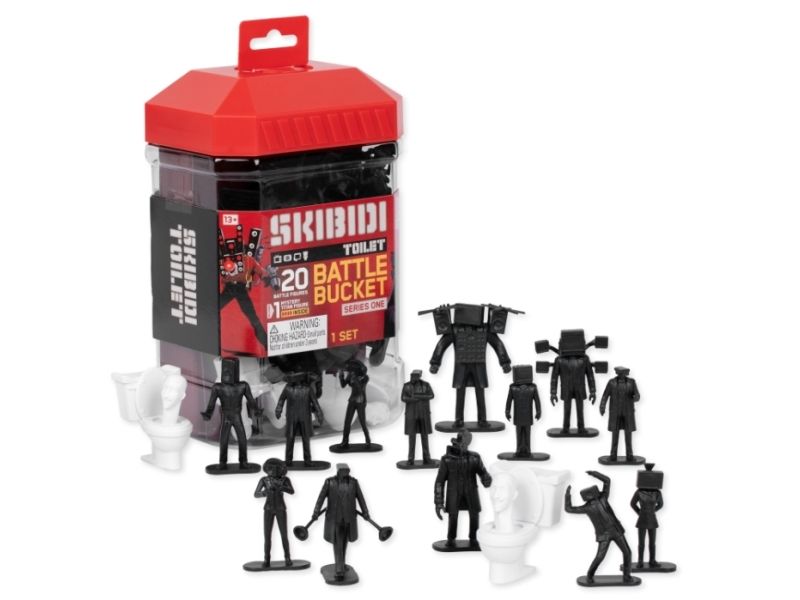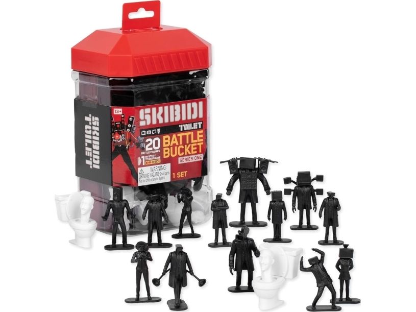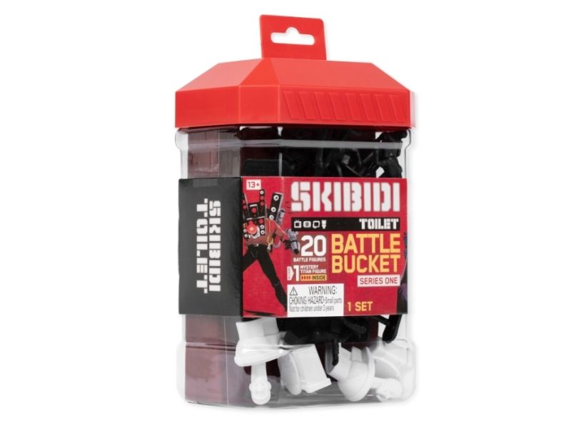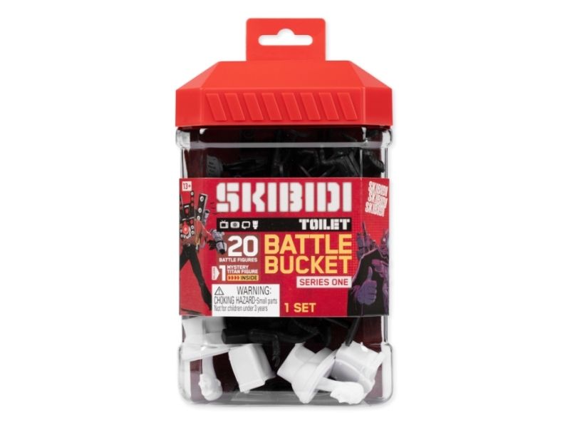 Skibidi Toilet er den rekord-sættende animerede YouTube-serie, der gik fra viral sensation til kulturelt fænomen. Sci-fi-serien skildrer de kaotiske eventyr af en alliance af humanoider med tv-apparater, kameraer og højttalere som hoveder i deres kamp mod Skibidi Toilets – toiletter, der ikke bare er sanitære installationer, men levende, planlæggende væsener med egne ambitioner. Battle Bucket er det ultimative sæt for Skibidi Toilet-fans til at genskabe episke kampe fra YouTube-kanalen! Det indeholder 20 samlefigurer i alt, inklusive en Mystery Titan-figur! Den indeholder karakterer fra begge sider af konflikten, så fans kan vælge at kæmpe på Skibidi Toiletternes eller Alliancens side! Tjek DaFuq!?Boom!-YouTube-kanalen og se legetøjet i aktion i videoerne!