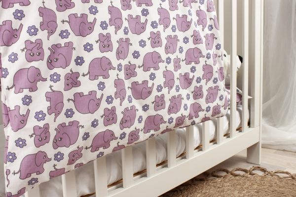 Søte elefanter og små blomster i retrostil. Sengesett SoveTrine fra Night & Day med det ikoniske designet fra 1970-tallet. Sengesettet er laget av 100 % bomull og percalvev for et glatt, mykt og behagelig sengesett som er ekstremt slitesterkt. Sengesettet består av dyne og putevar med skjult glidelås.