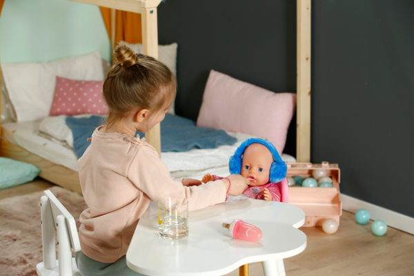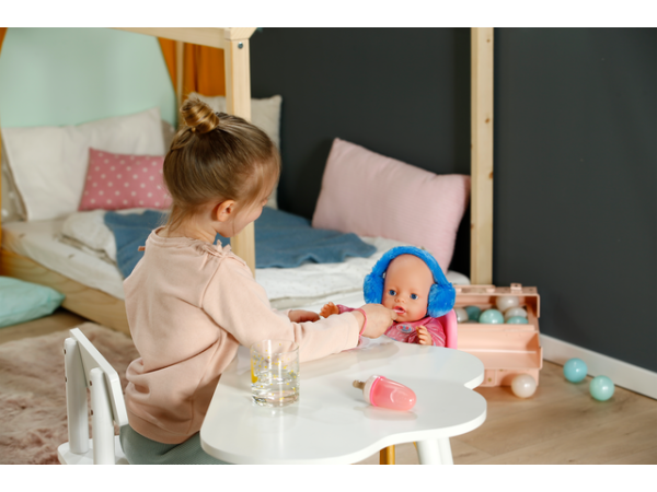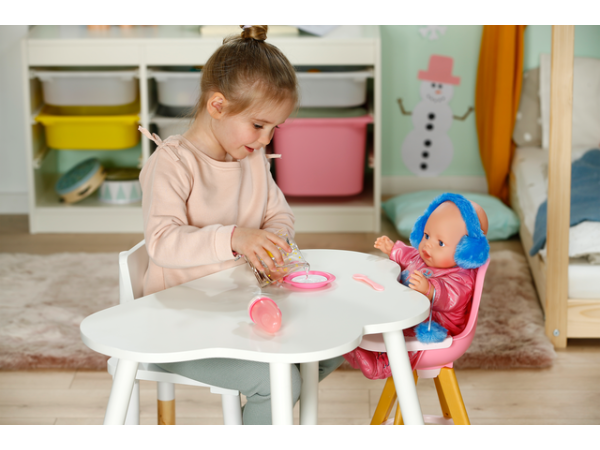 BABY born Emma bringer masse moro inn i barnerommet med sine 10 livaktige funksjoner: drikking, bading, kontrollert pottetrening, lukking av øynene ved å vri på smokken og mye mer. Hun spiser fra sin lille tallerken, hvor maten er synlig takket være matingens magi. Jeg lurer på hva som er på menyen i dag? I tillegg til hennes magiske tallerken og potte, følger det med masse tilbehør som garanterer kreativ moro i klassisk babylek for barn fra 3 år og oppover.